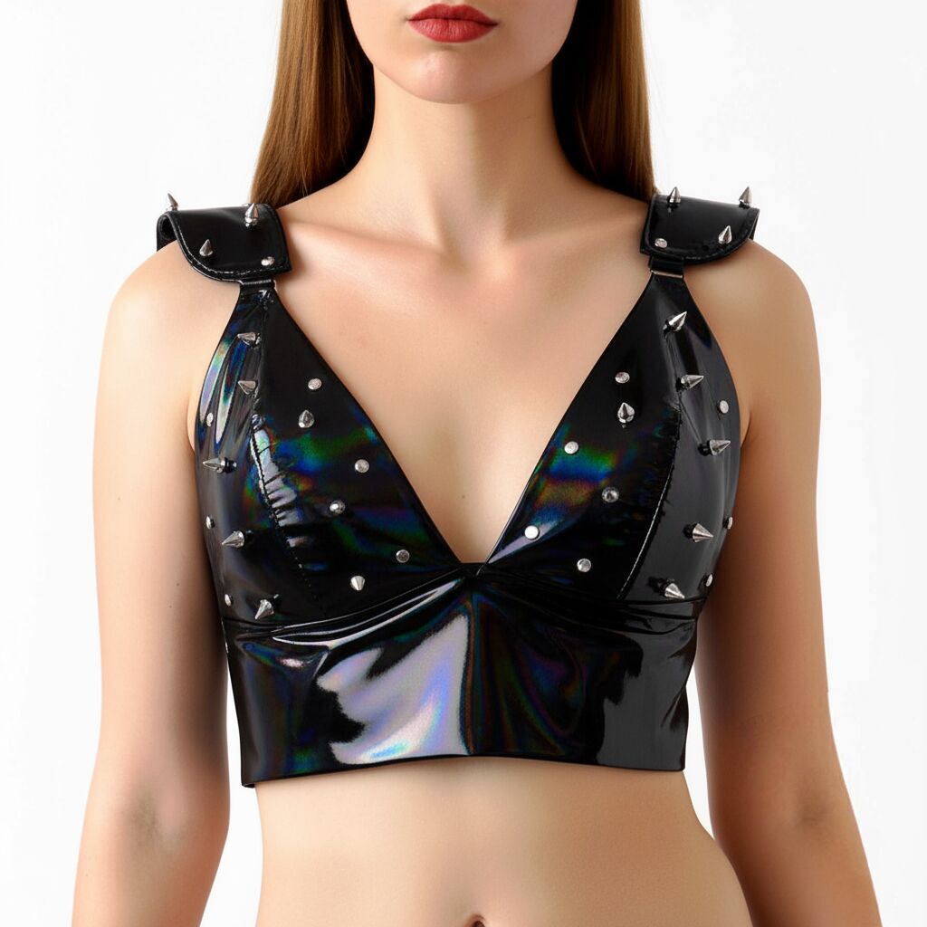 Ефектний вініловий топ Mistress створений для сміливих образів і впевненого самовираження. Глибокий V-подібний виріз підкреслює лінію декольте, а щільна посадка формує виразний силует. Декоративні металеві шипи на чашках і плечах надають моделі характеру та роблять її акцентною деталлю образу.
