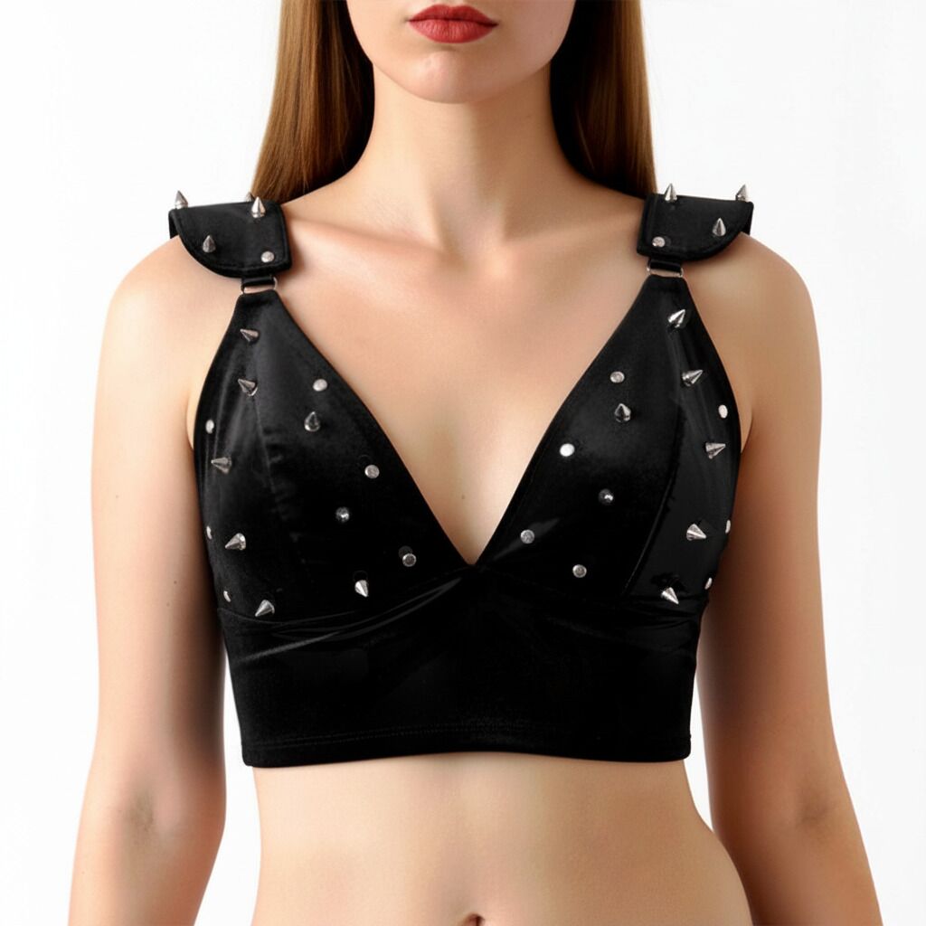 Ефектний вініловий топ Mistress створений для сміливих образів і впевненого самовираження. Глибокий V-подібний виріз підкреслює лінію декольте, а щільна посадка формує виразний силует. Декоративні металеві шипи на чашках і плечах надають моделі характеру та роблять її акцентною деталлю образу.