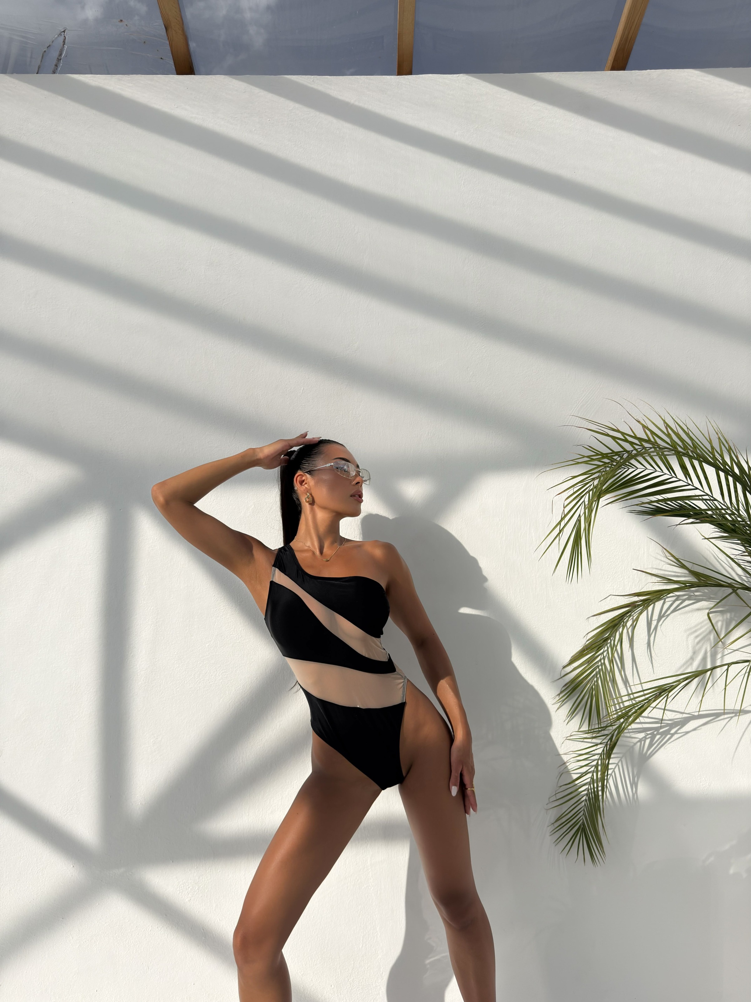 Суцільний асиметричний купальник чорного кольору з сітчастими вставками – ідеальний вибір для тих, хто хоче виглядати елегантно, сучасно й сексуально.