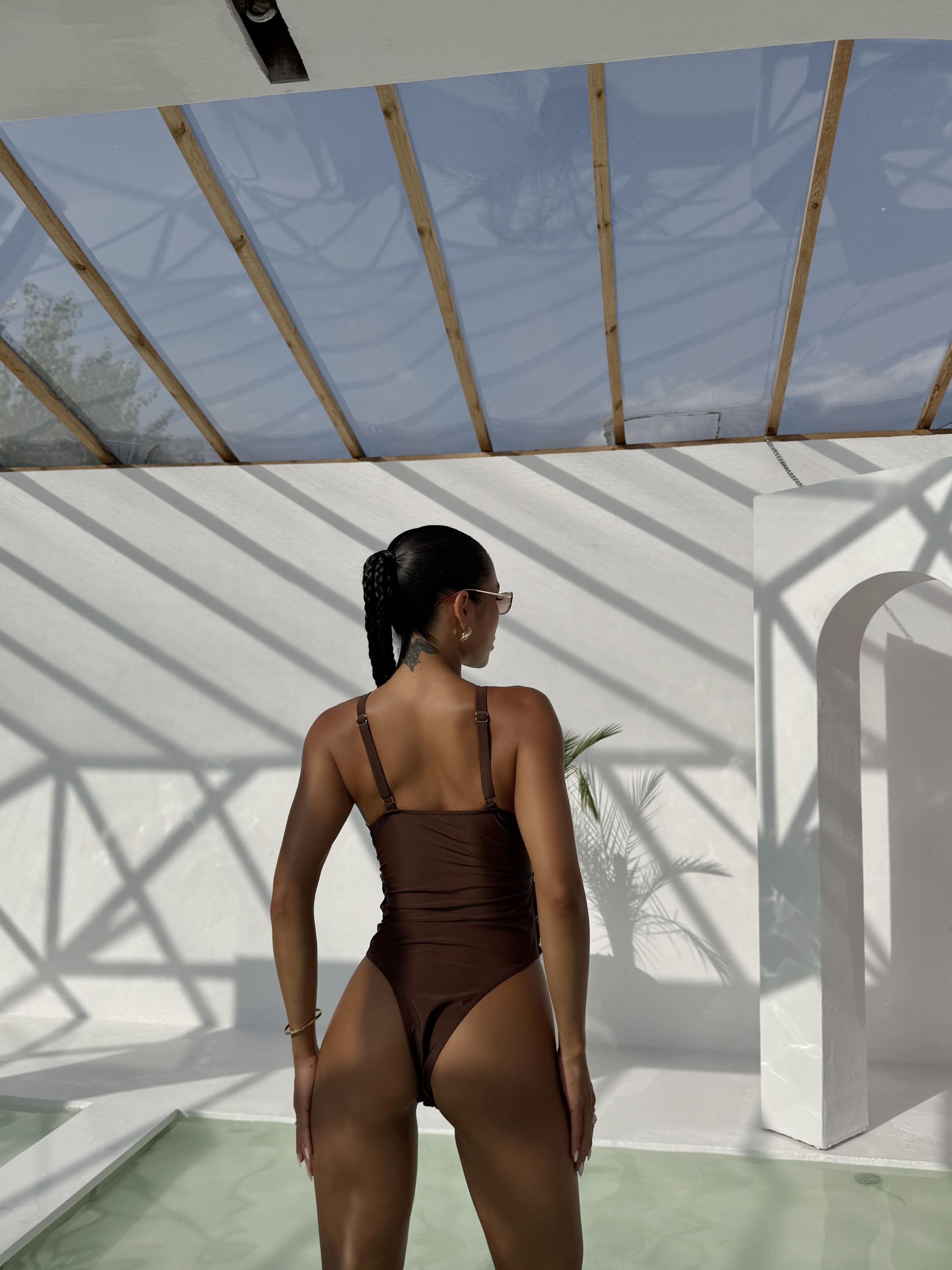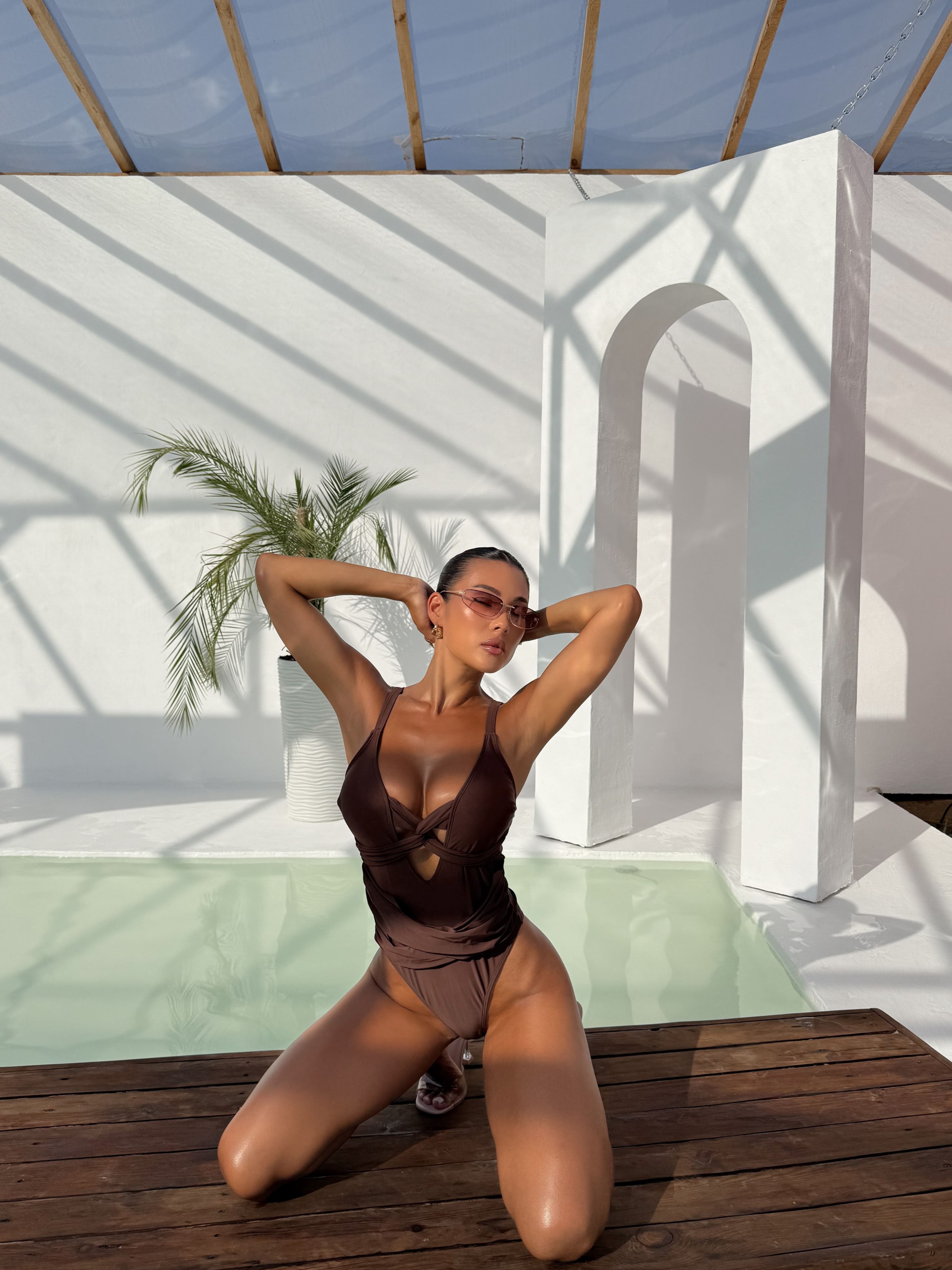 Суцільний купальник — акцент на фігуру і безкомпромісна естетика. Стриманий, але ефектний дизайн з перехрестям на грудях і глибоким вирізом створює витончений силует. Щільна тканина добре тримає форму, а зав’язки дозволяють ідеально підлаштувати посадку.