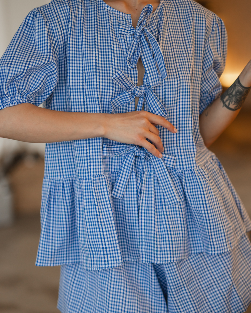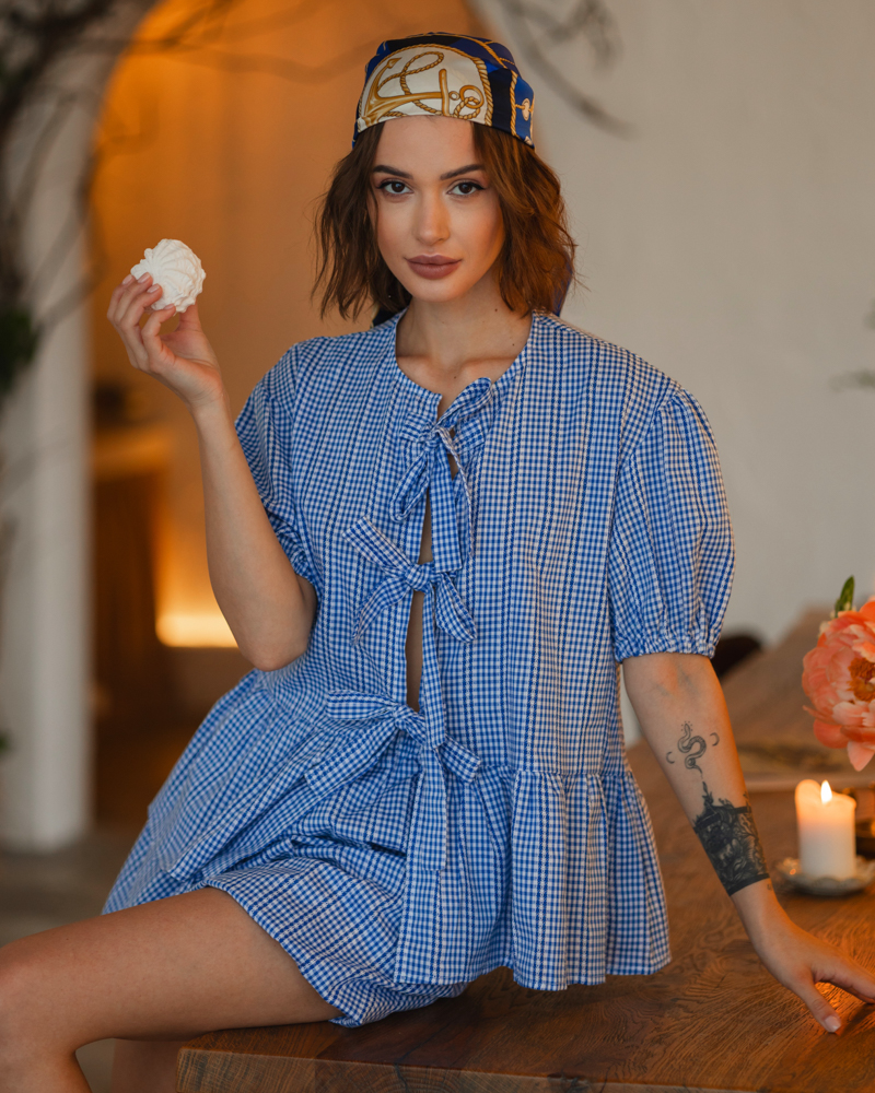 Комплект: сорочка на зав'язках з баскою, з короткими рукавами-ліхтариками та вільні шорти на резинці.