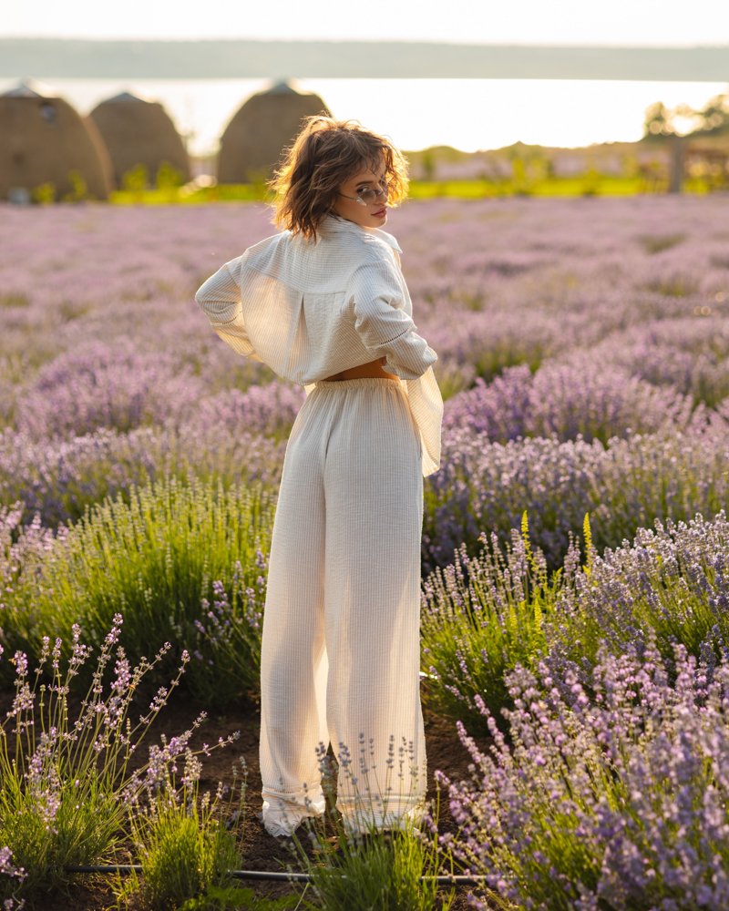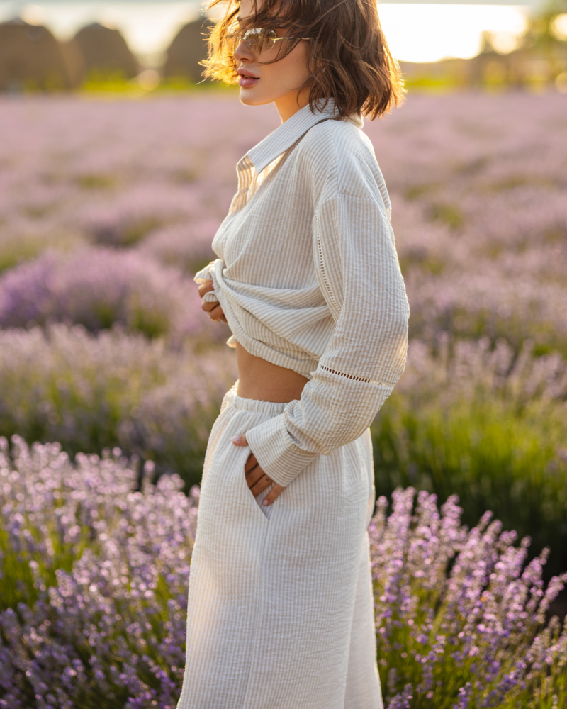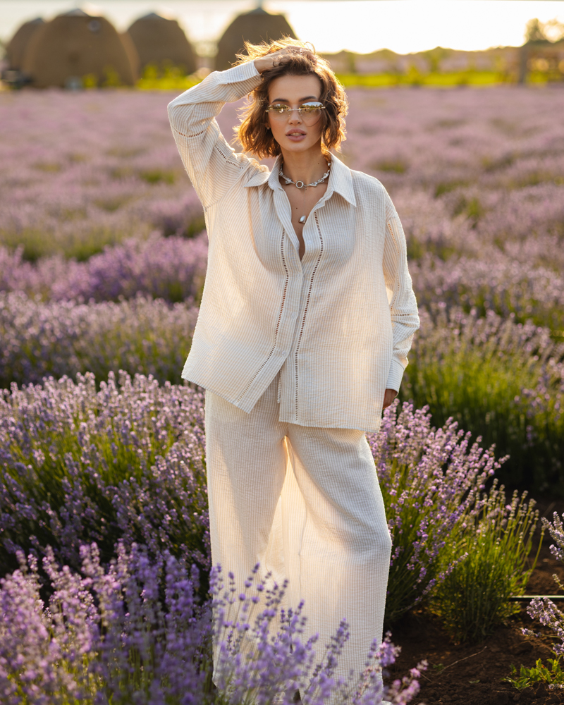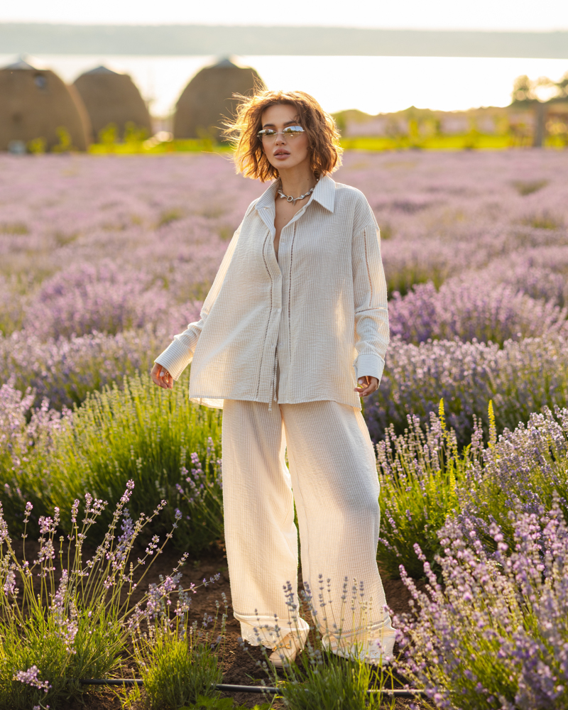 Комплект: довга сорочка на гудзиках, вільного крою штани-палаццо на резинці зі шнурком та кишенями, короткі шорти на зав'язці.