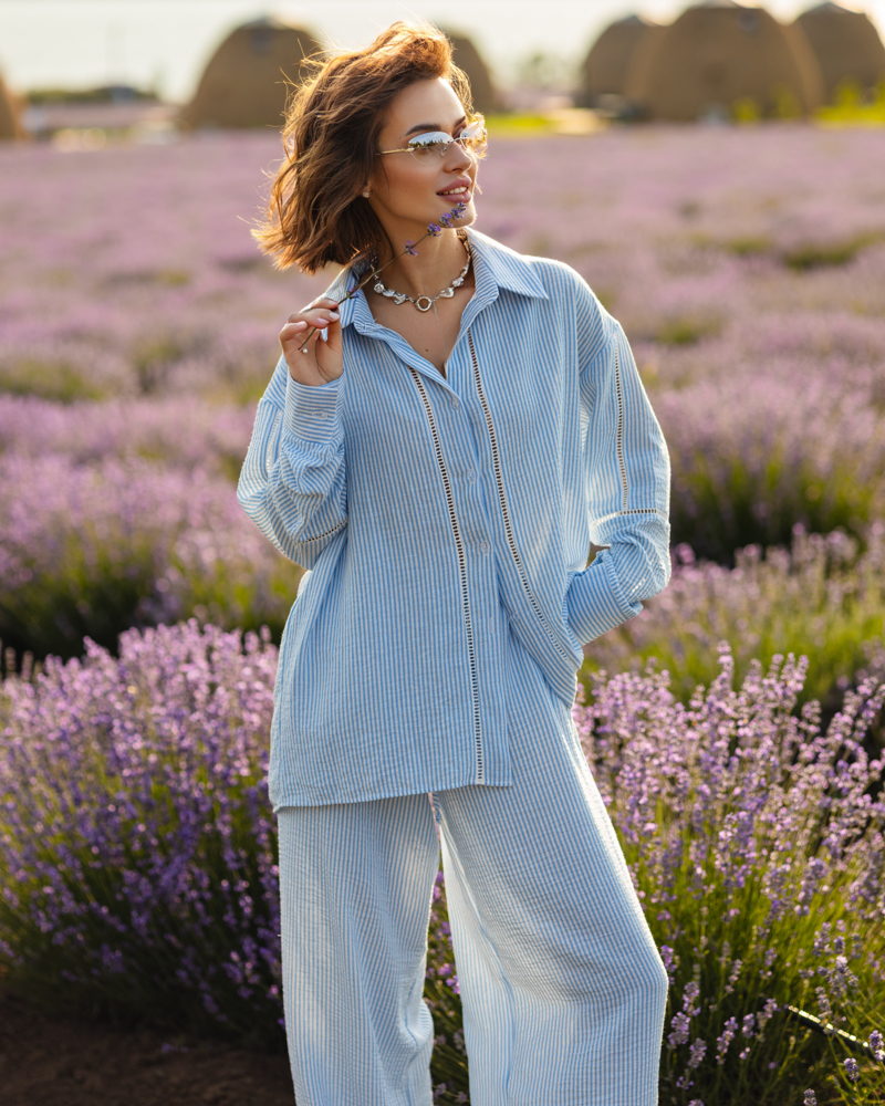 Комплект: довга сорочка на гудзиках, вільного крою штани-палаццо на резинці зі шнурком та кишенями, короткі шорти на зав'язці.
