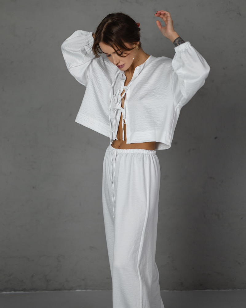 Комплект: сорочка на зав'язках з рукавами на резинці, вільного крою штани з зав'язкою на поясі.