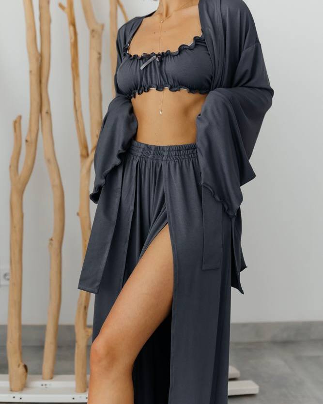 Комплект: халат із широкими рукавами, зручний ліф без чашочок з резинчастою основою на застібці та вільного крою довгі штани із розрізами спереду.