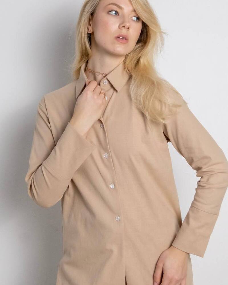 Комплект: довга сорочка на ґудзиках із манжетами та штани вільного крою - кльош на резинці із зав'язкою.