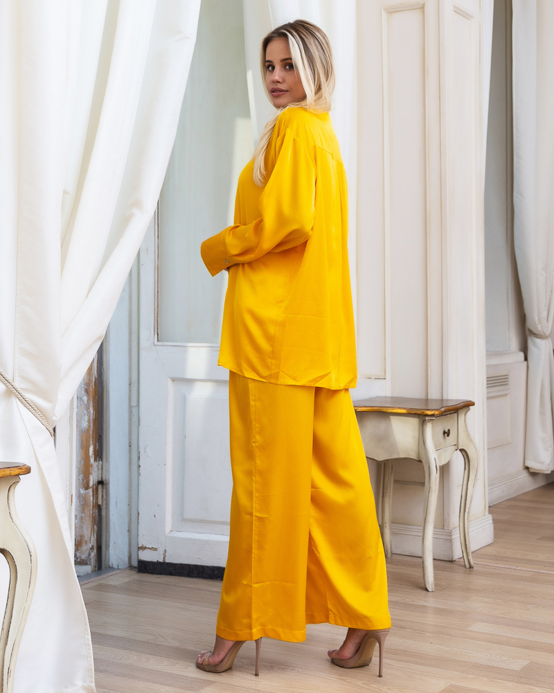 Повітряна сорочка на ґудзиках з високим манжетом та коміром, вільні штани на резинці зі шнурком.