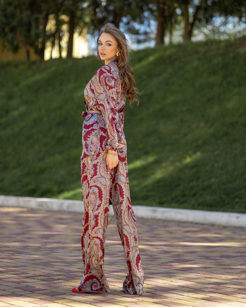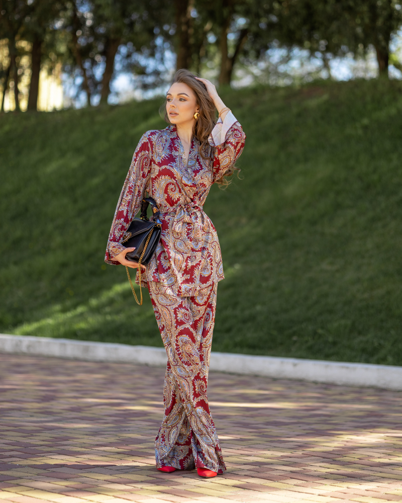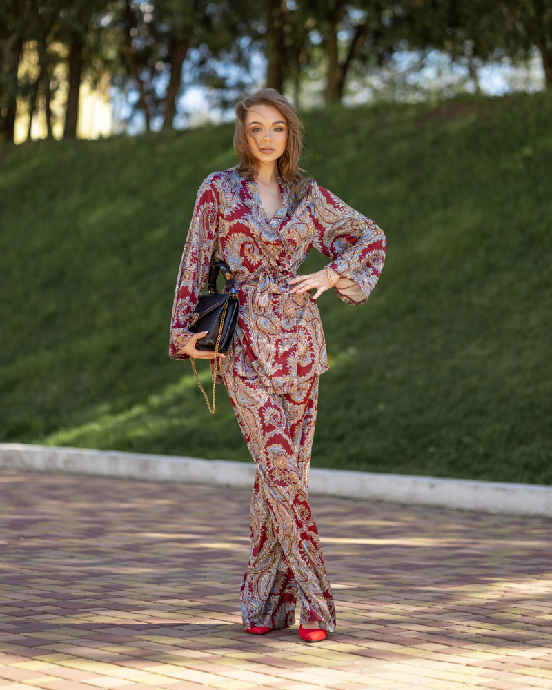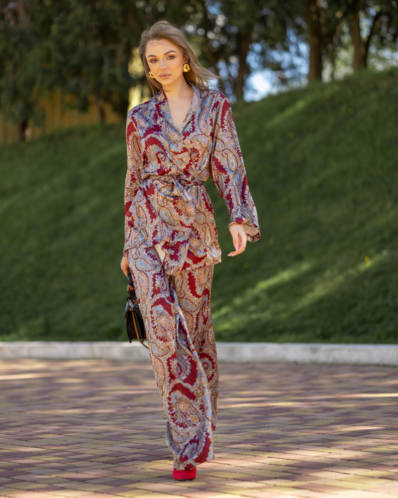 Комплект: Сорочка + Штани прямого крою. Класичні штани вільного крою з резинкою на талії і кишенями. Сорочка з поясом на талії, що дозволить скорегувати силует. Виконаний з приємного до тіла шовку Армані. Чудово підійде для літніх прогулянок або для домашнього дозвілля.