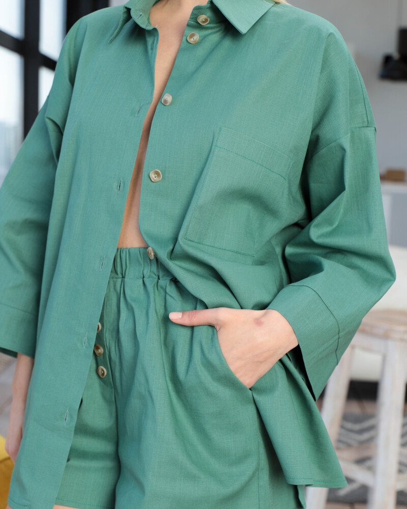 Комплект: сорочка із довгими рукавами та вільні шорти на резинці із кишенями.