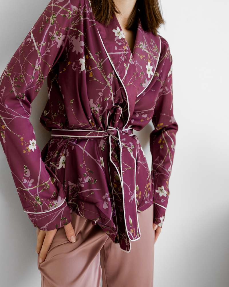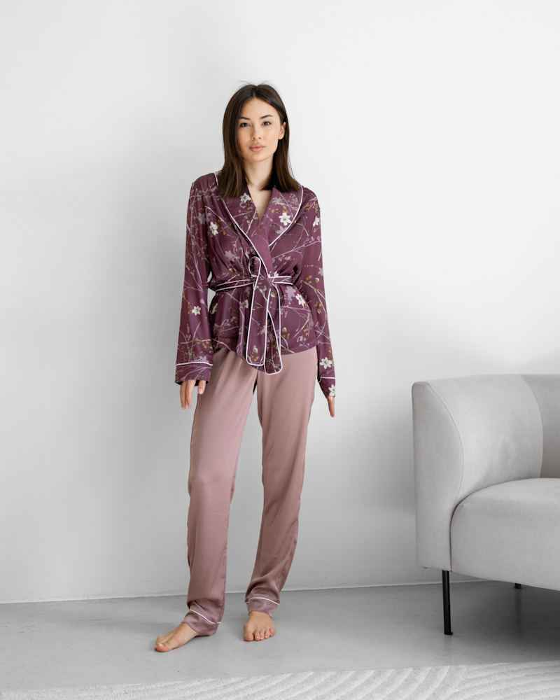 Зручний домашній костюм із тканини шовк Армані з квітковим візерунком, яка легка та приємна на дотик.
