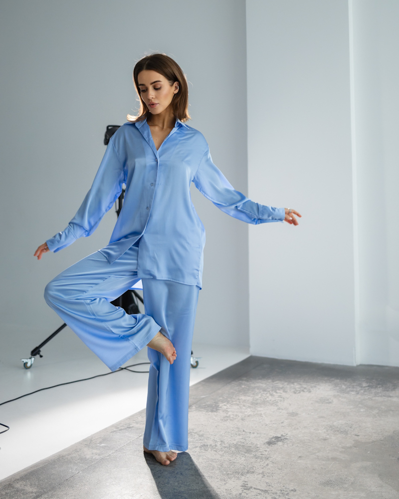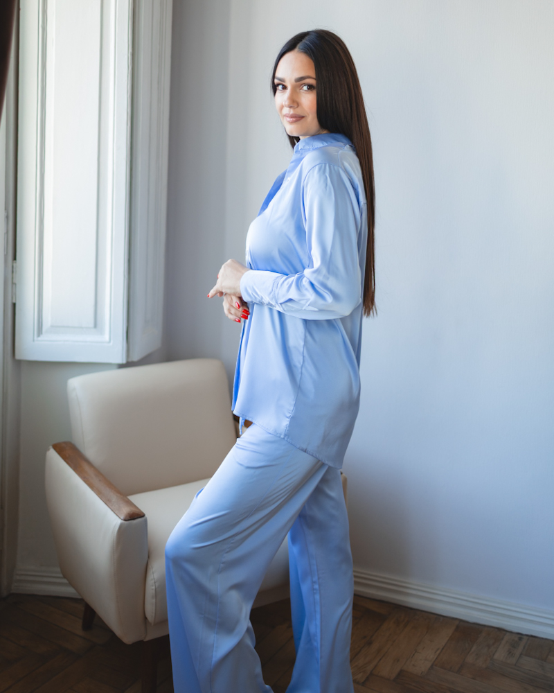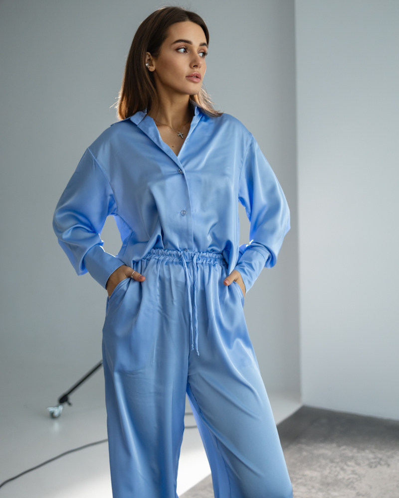 Повітряна сорочка на ґудзиках з високим манжетом та коміром, вільні штани на резинці зі шнурком.