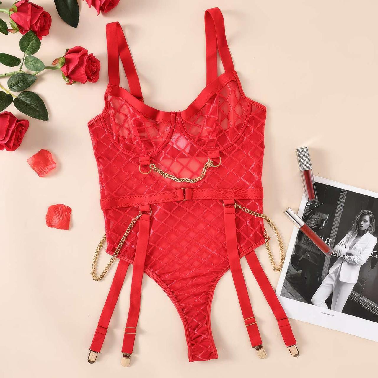Боді еротичне сітчасте з квітковим принтом з підтяжками поліестер-спандекс M/L Червоне