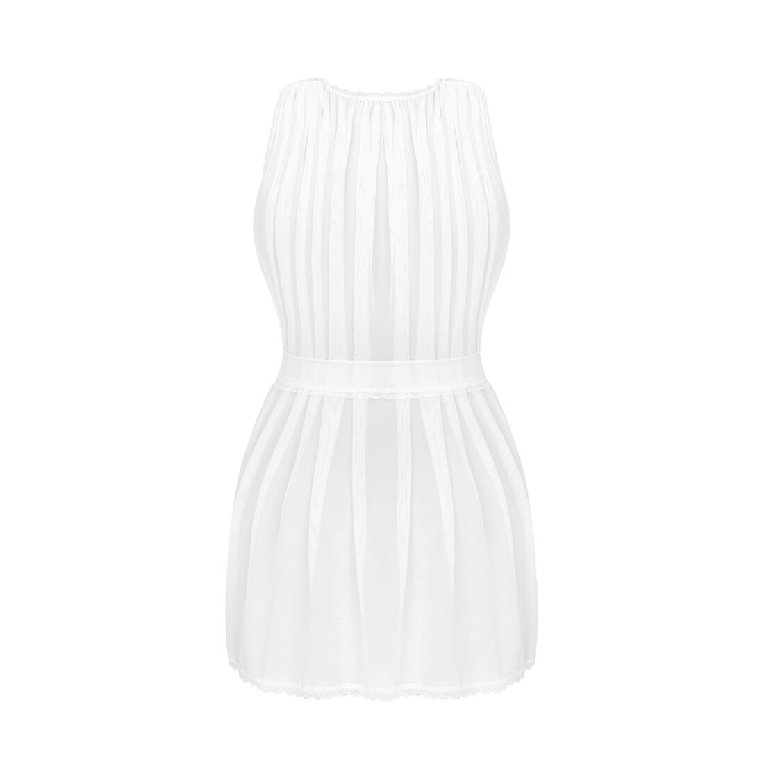 Напівпрозорий пеньюар Obsessive Heavenlly peignoir пошито з найтоншого легенького матеріалу, який лише злегка прикриває тіло, лягаючи м'якими хвилястими складками й пестячи шкіру. Пеньюар виконаний у вигляді мініхалатика з поясом і без рукавів. Поли пеньюара облямовані тонким і широким мереживом у дрібну симпатичну квіточку, що додає білизні ніжності та витонченості. Поясок підкреслює талію і не дає неслухняним полам пеньюара оголювати спокусливі частини тіла.