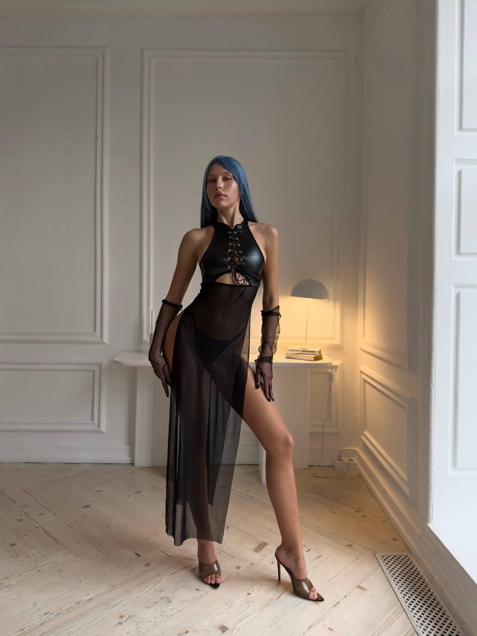 Сексуальна комбінація з еко-шкіри та сітки, що залишає рівно стільки, скільки треба, щоб розпалити фантазію