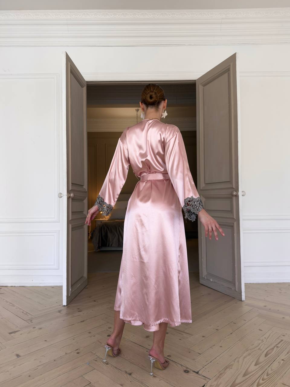 Розкішний комплект із гладкого атласу насиченого кольору — ідеальне поєднання жіночності та комфорту. Нічна сорочка з глибоким декольте прикрашена вишуканим мереживом, тонкі бретелі додають ніжності образу. Легкий халат із мереживними вставками на рукавах доповнює комплект і створює вишуканий силует.