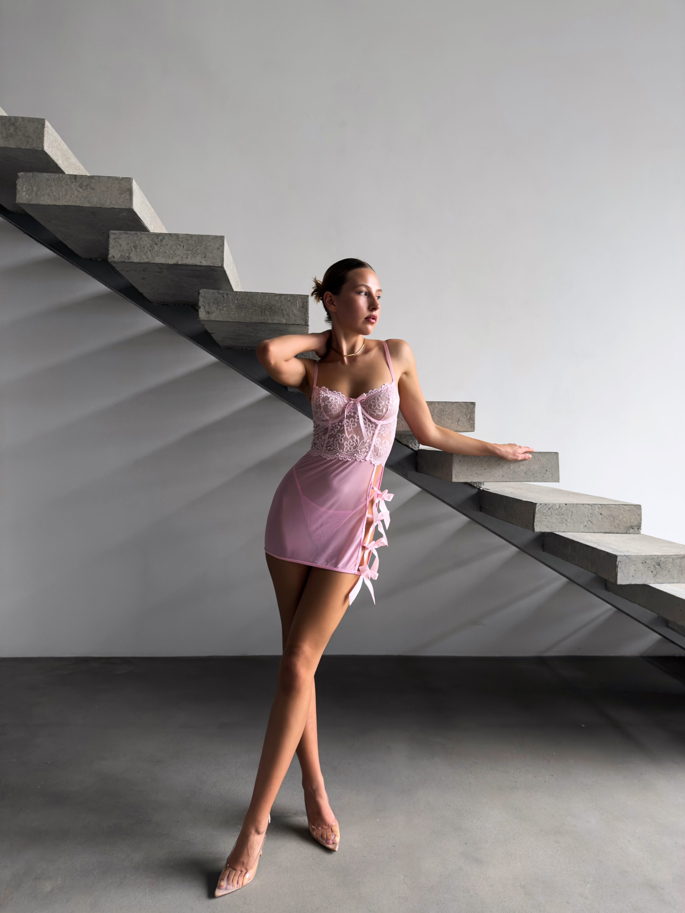 Пеньюар з мереживом і розрізом, прикрашеним бантиками — створений, щоб підкреслити жіночність і привабливість.