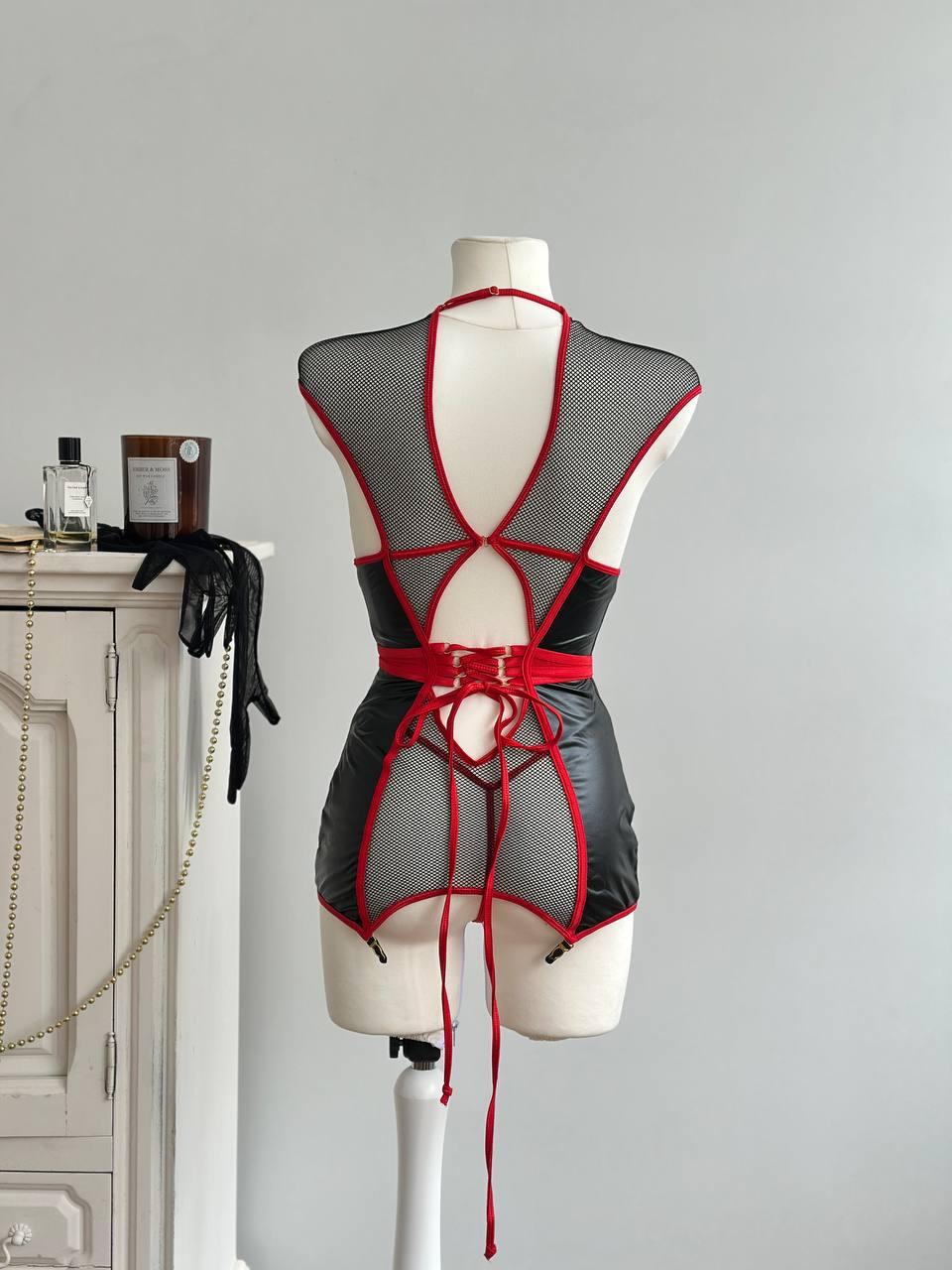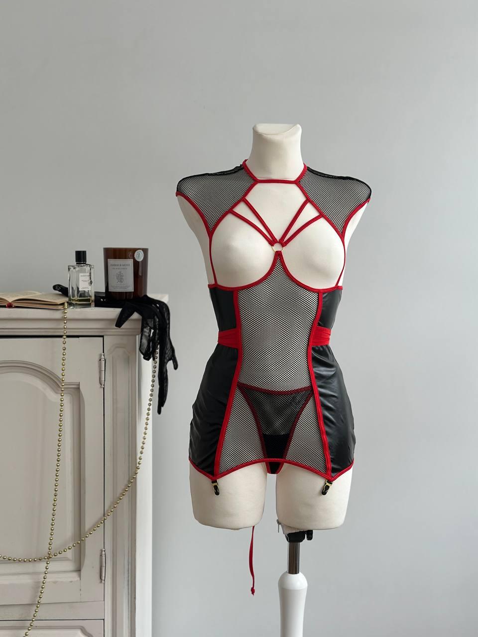 Еротична сукня-білизна з сітки та екошкіри з відкритими зонами декольте - сміливий варіант для тих, хто любить жорстку естетику та контроль