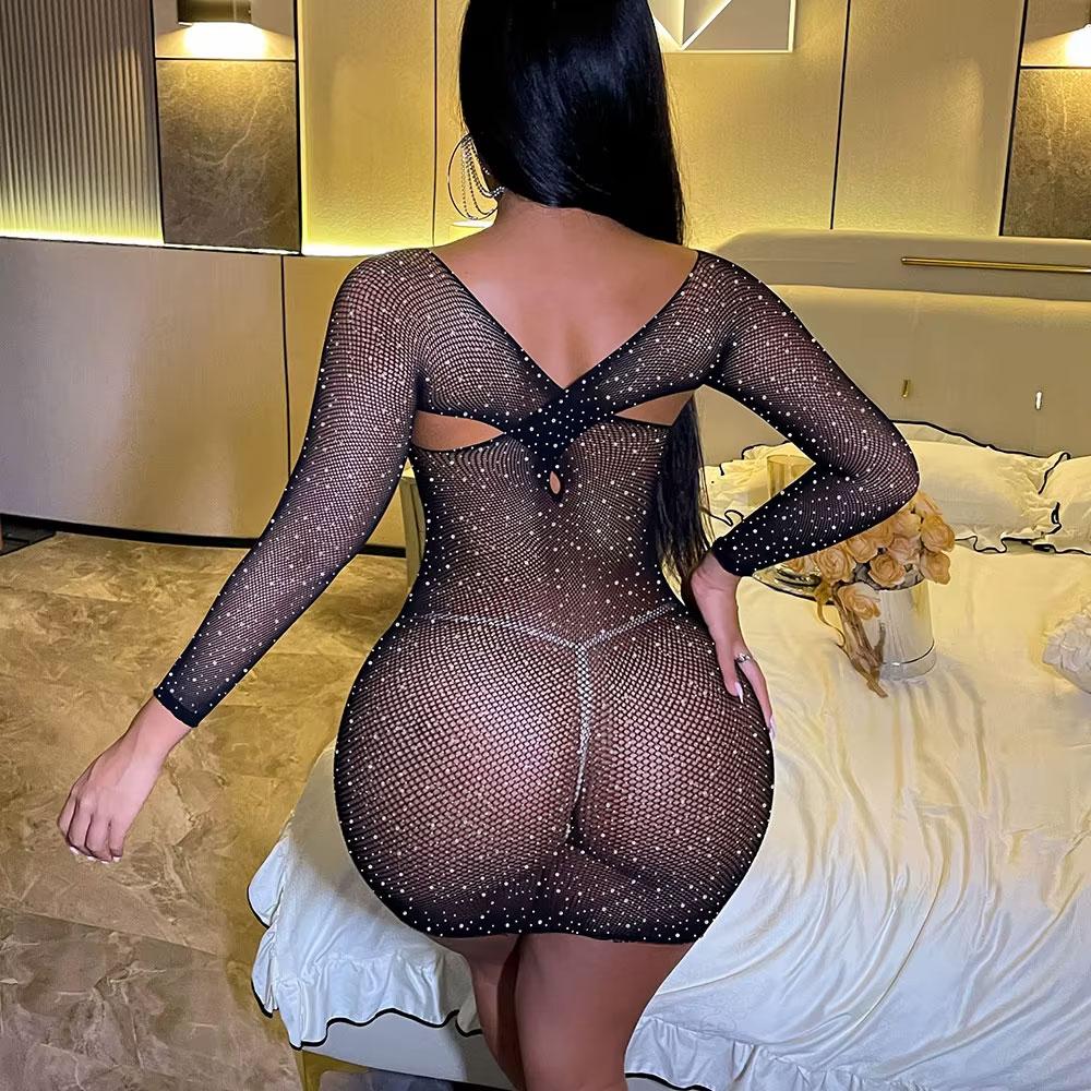 Еротична міні-сукня з мережива еластична зі стразами Чорна S/M/L