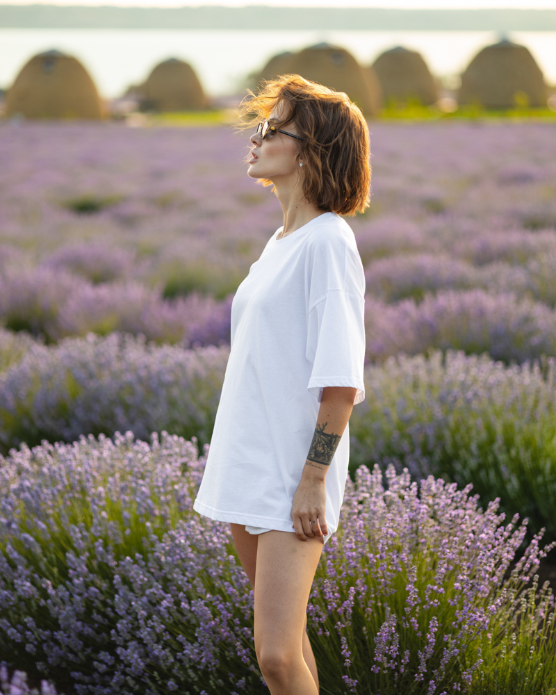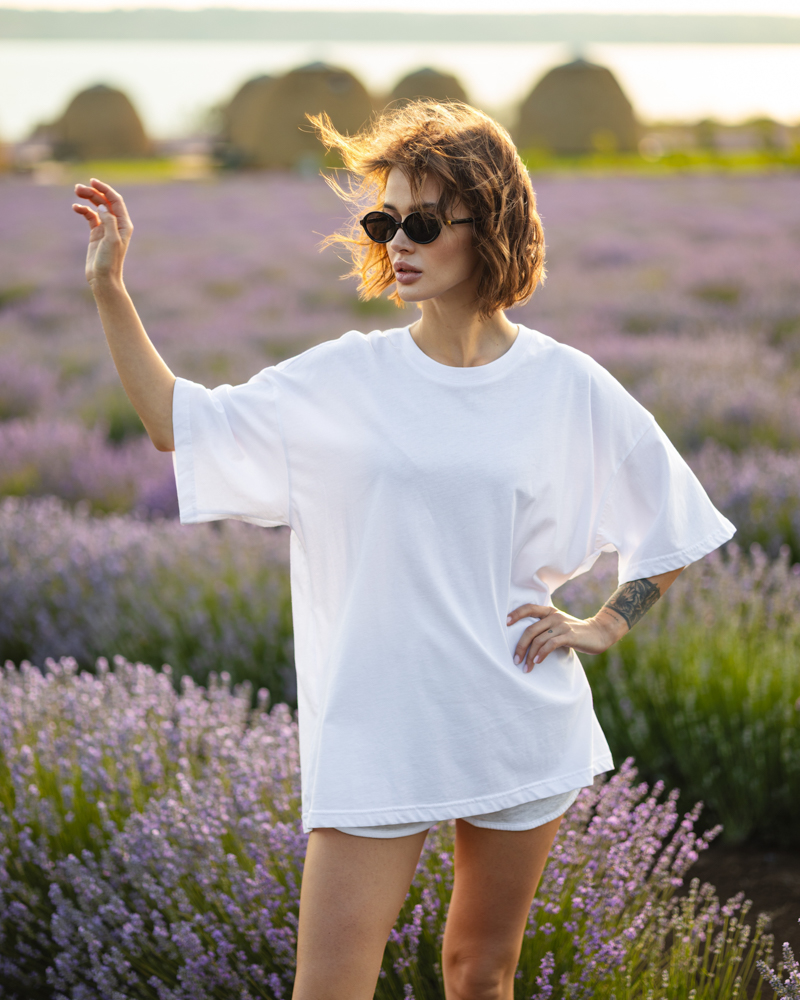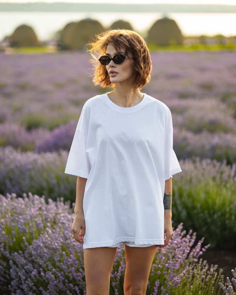 Футболка зроблена в універсальному розмірі S-M: об'єм грудей до 116 см, довжина 72 см