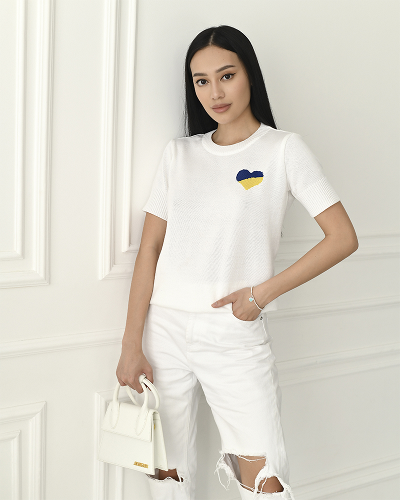 Патріотична футболка із матеріалу в'язка з жовто-блакитним серцем. Виріб м'який та приємний на дотик, добре пропускає повітря.
