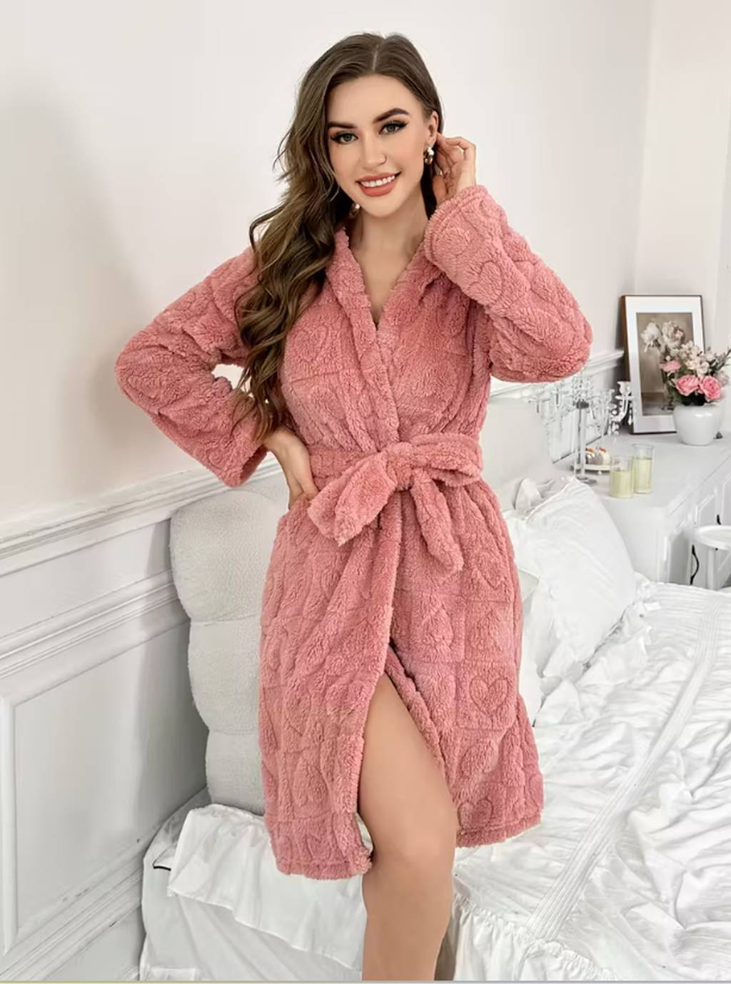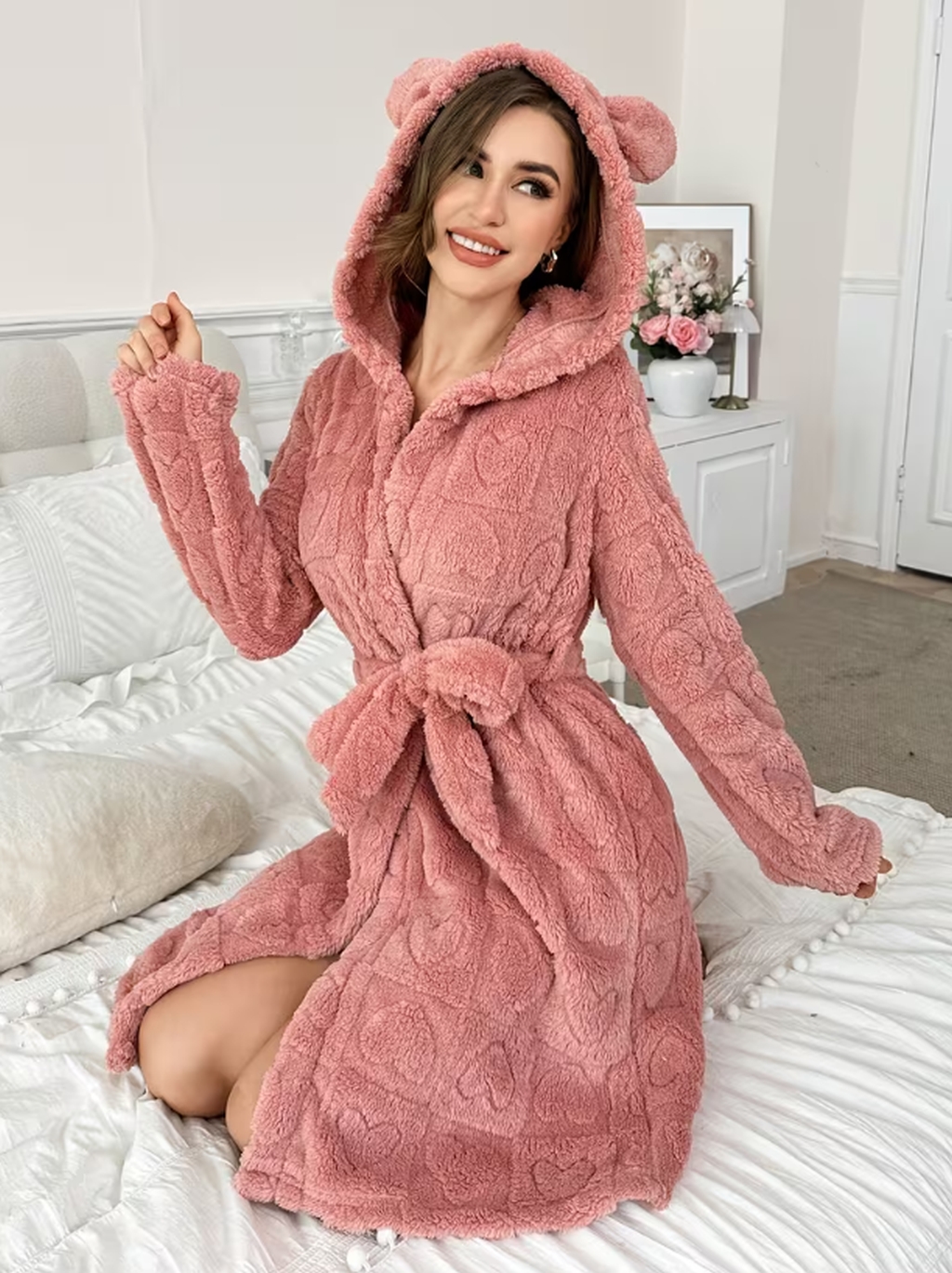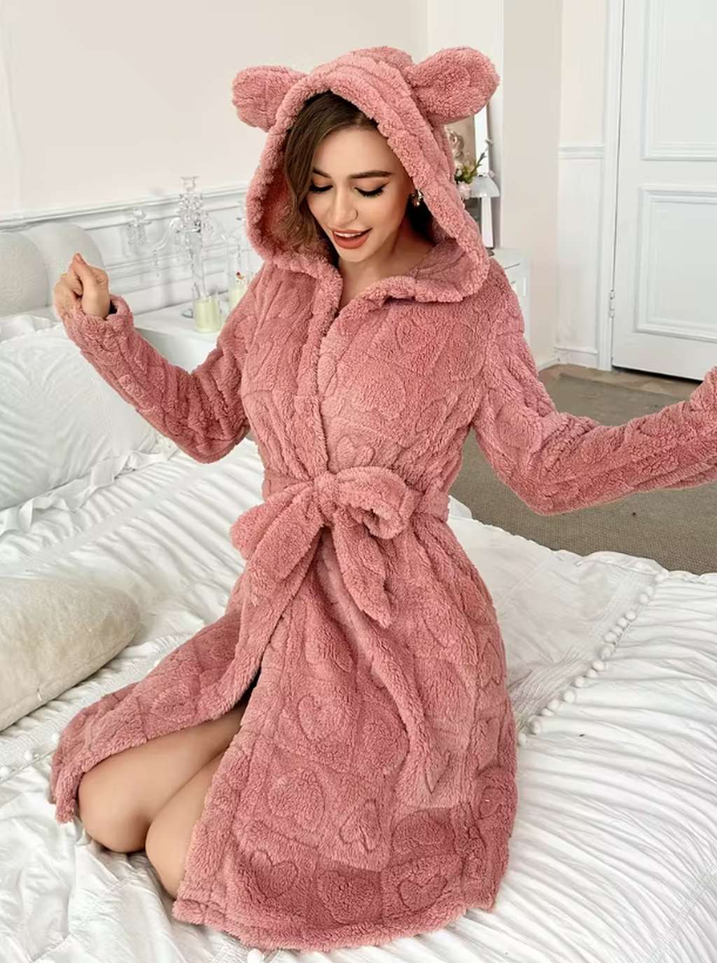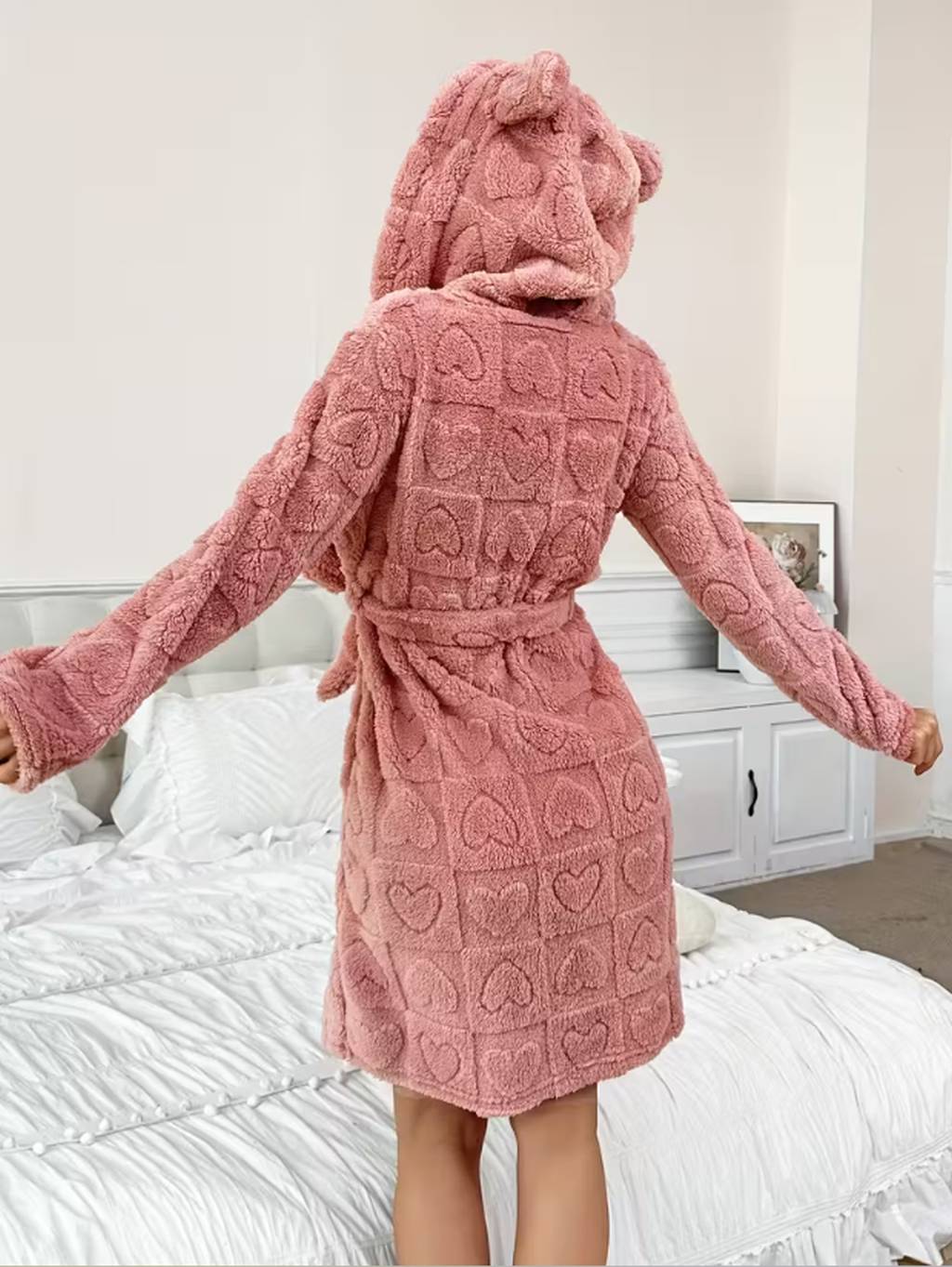 Махровий халат з сердечками вушками та капюшоном - пудра
