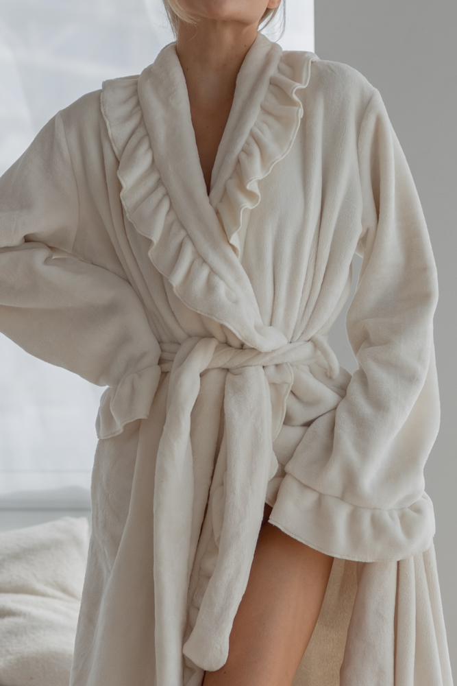 Халат просто незамінний для дому, якщо ви хочете відчувати комфорт. Він прекрашений рюшами на рукавах та по краю всього виробу.