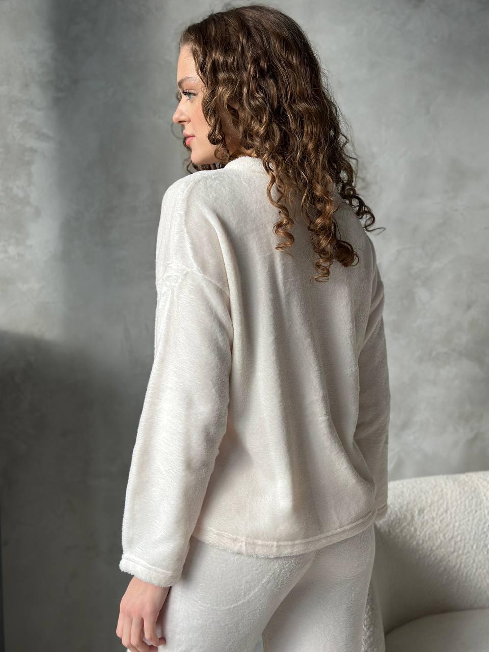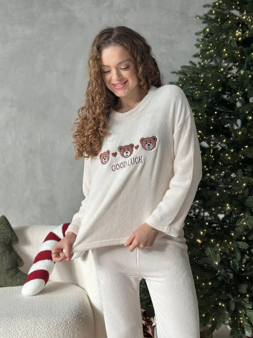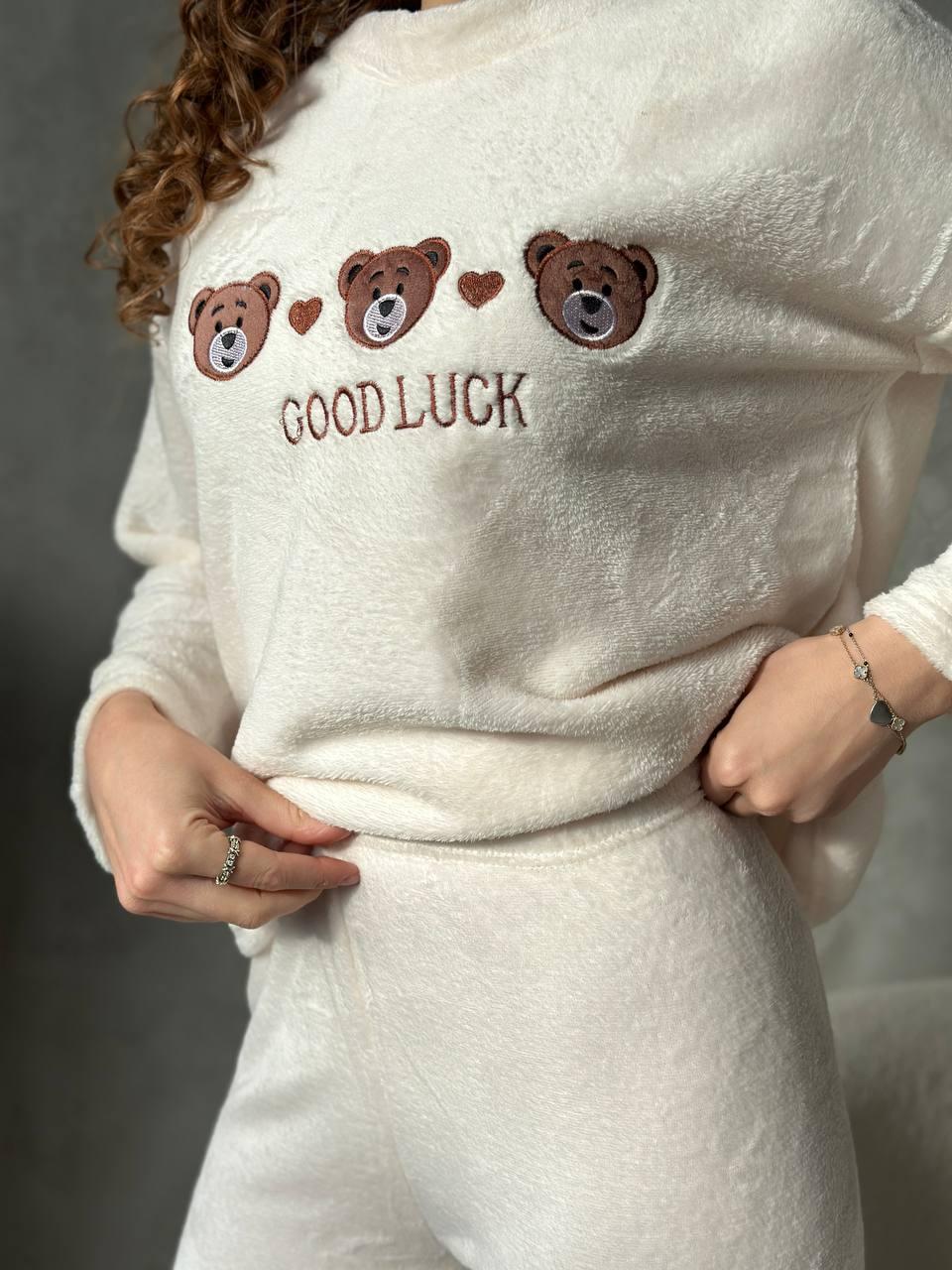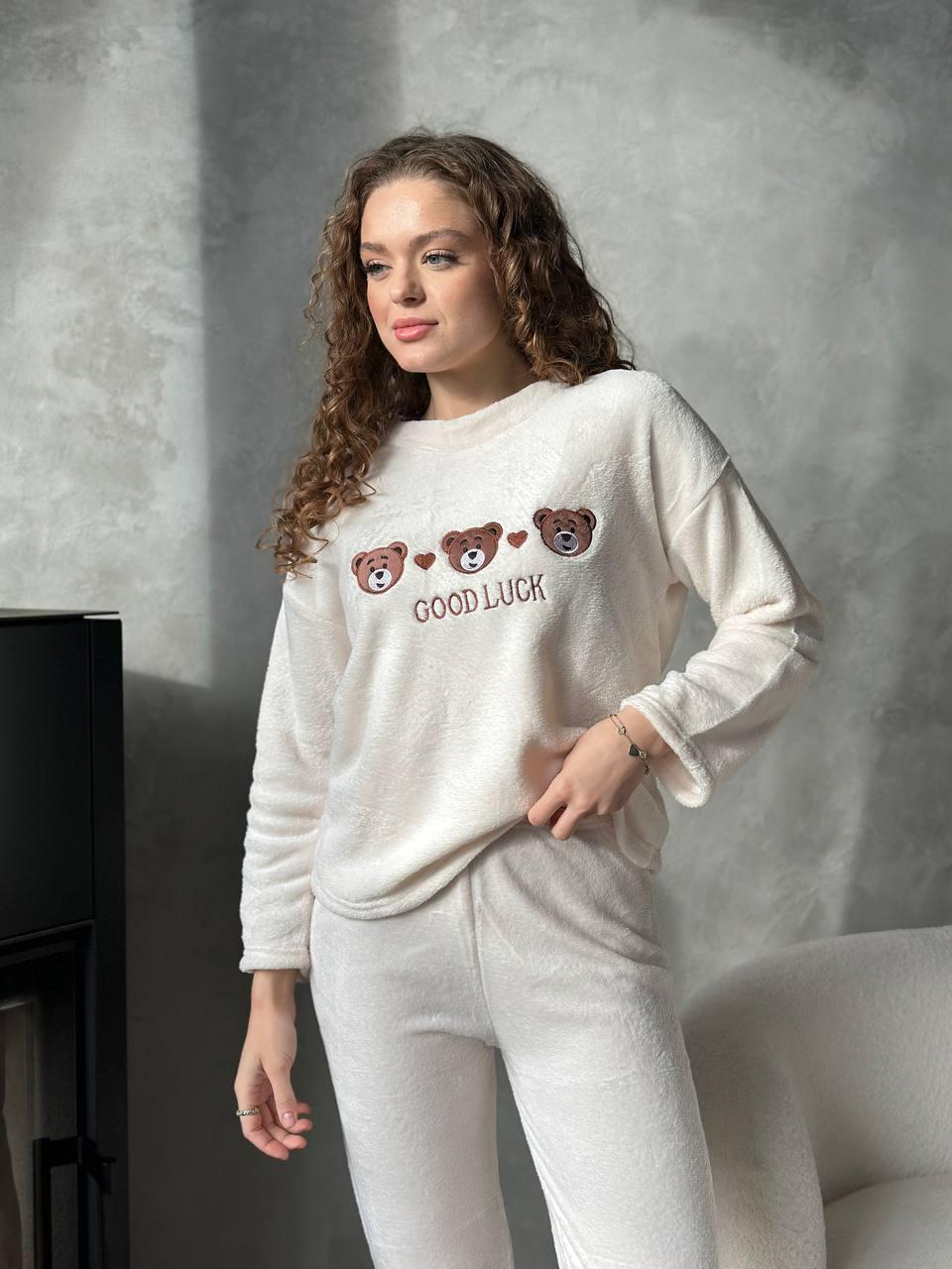 Ніжний кремовий колір, об’ємна плюшева текстура та вишивка з ведмедиком роблять образ одночасно милим і дуже домашнім