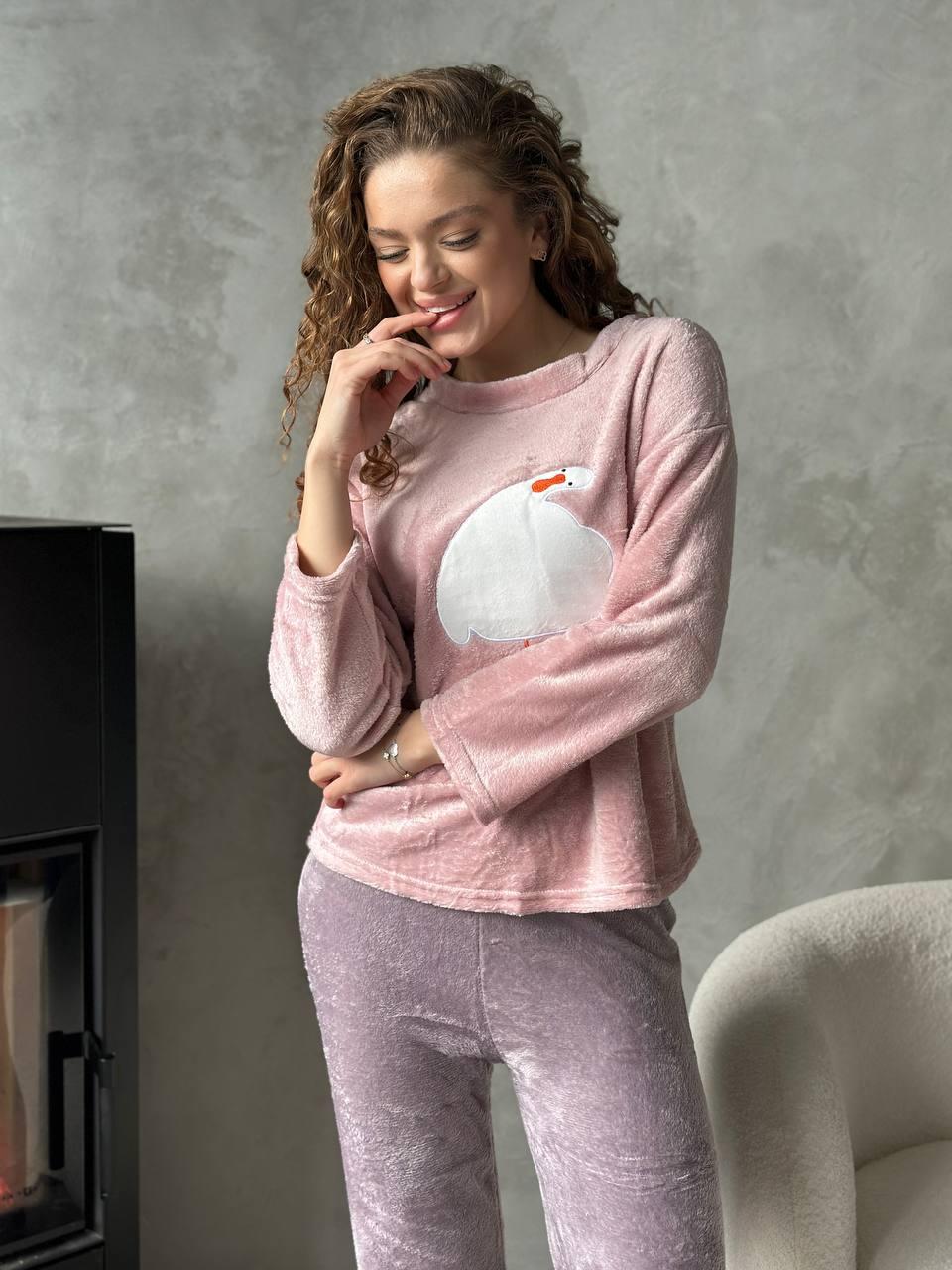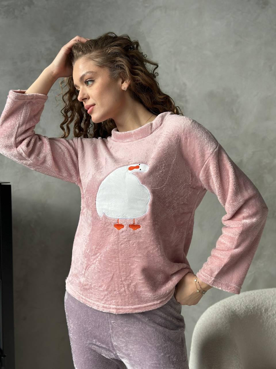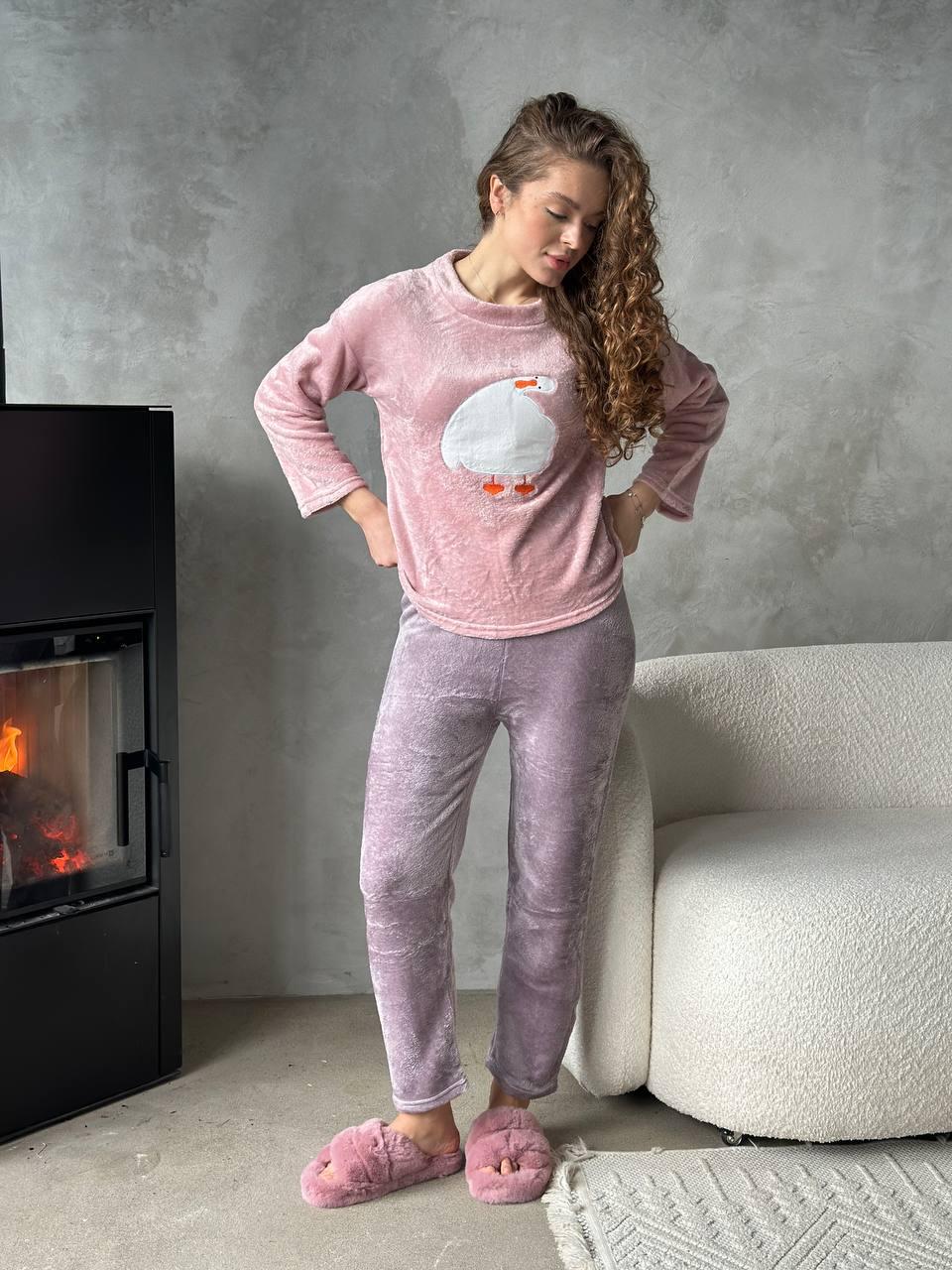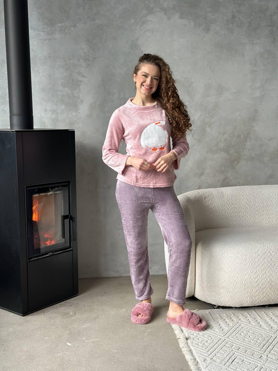 Наймиліша піжама сезону! Мʼяка, пухнаста, у ніжних рожево-бузкових відтінках, з кумедною аплікацією качечки - ця піжама створена для зимових вечорів під ялинкою й новорічних фільмів