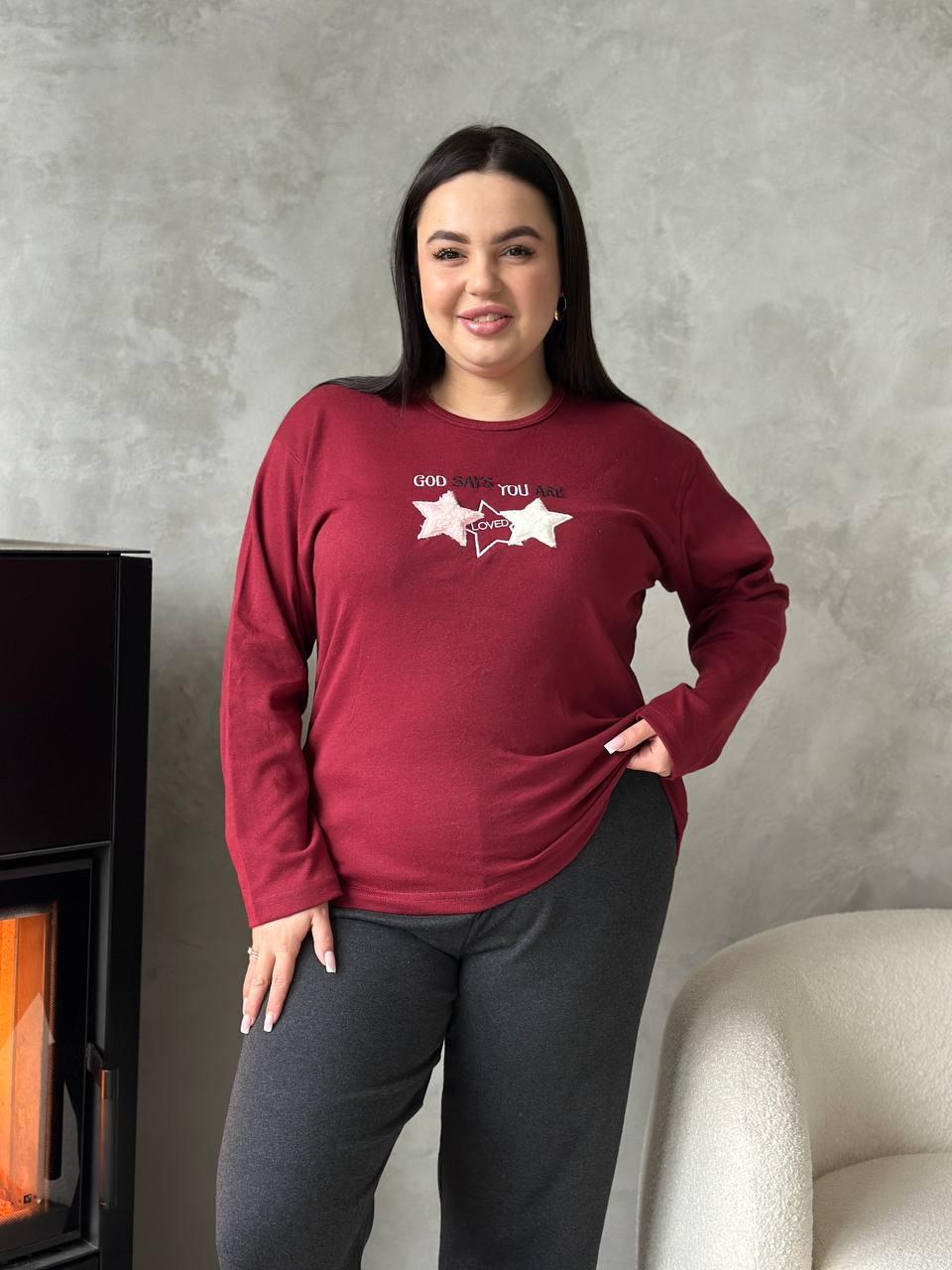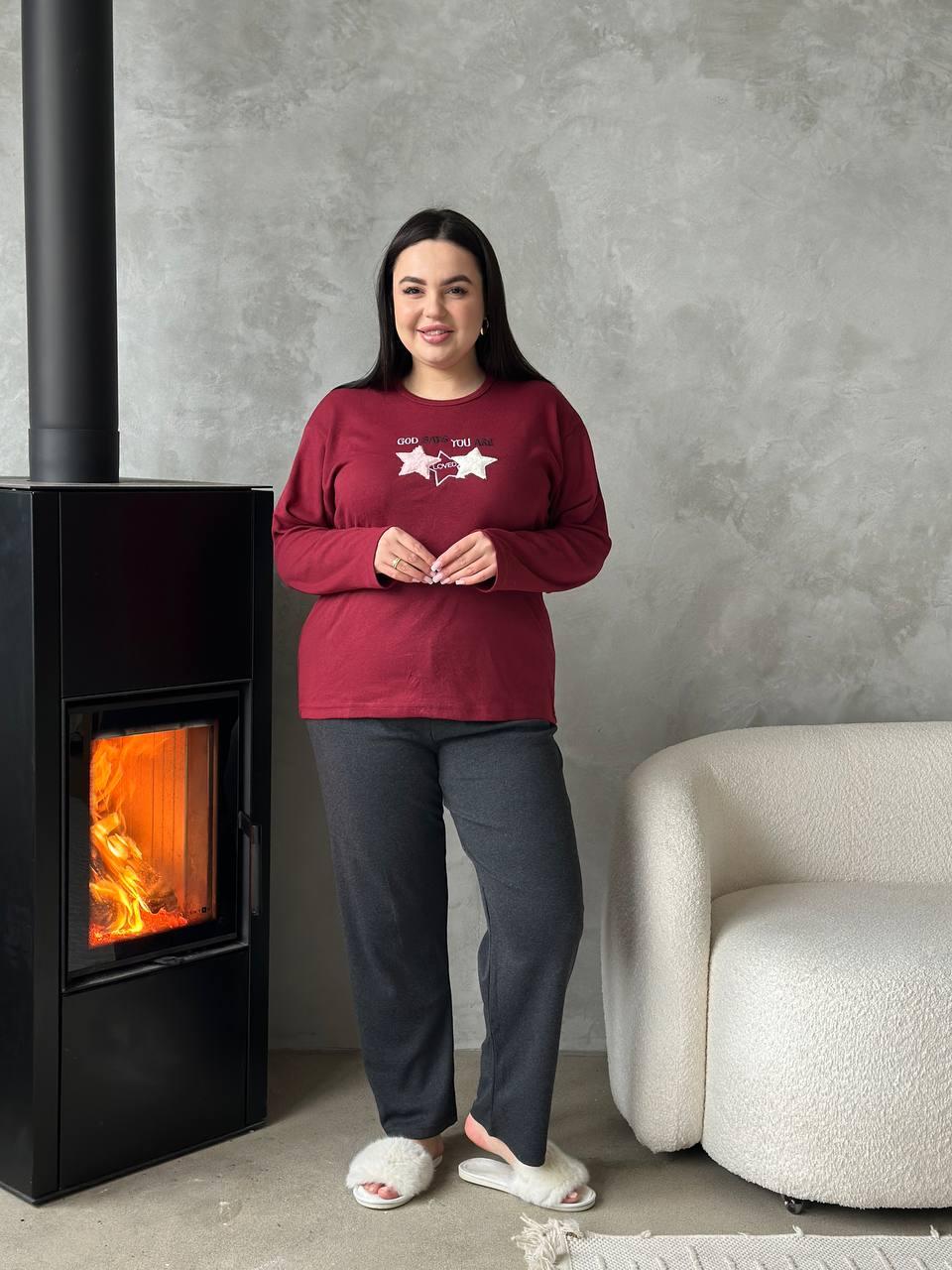 Зручна червона піжамка із зірочками та чорними штанами