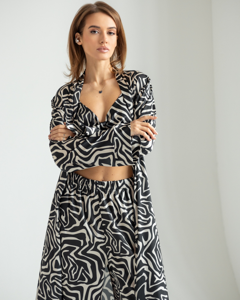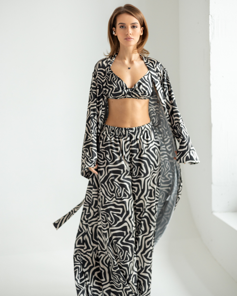 Піжамний костюм-трійка Helen італійський шовк (бра+халат+штани) Чорний з білим