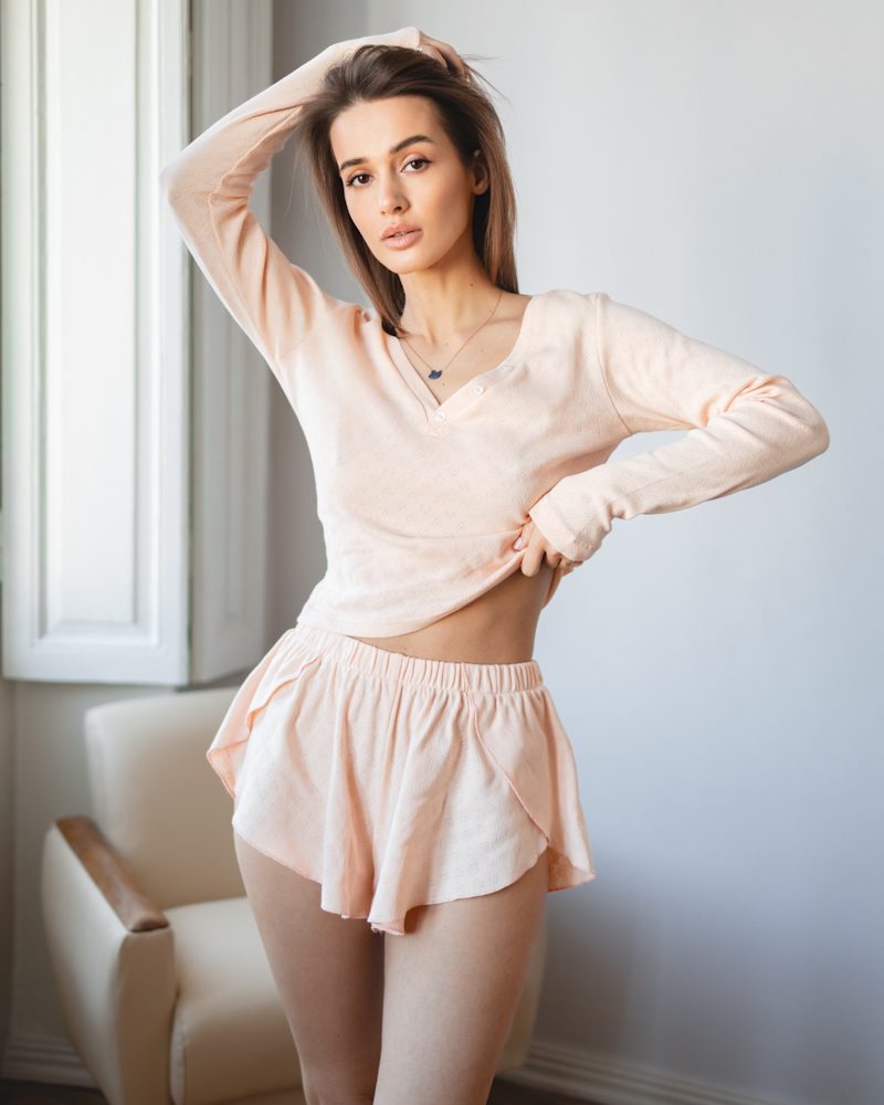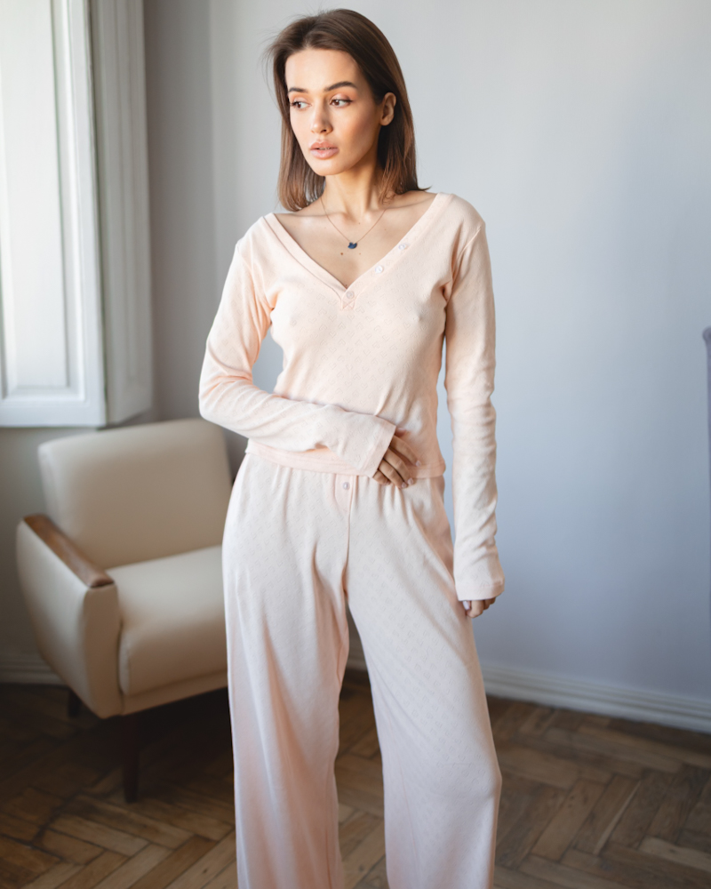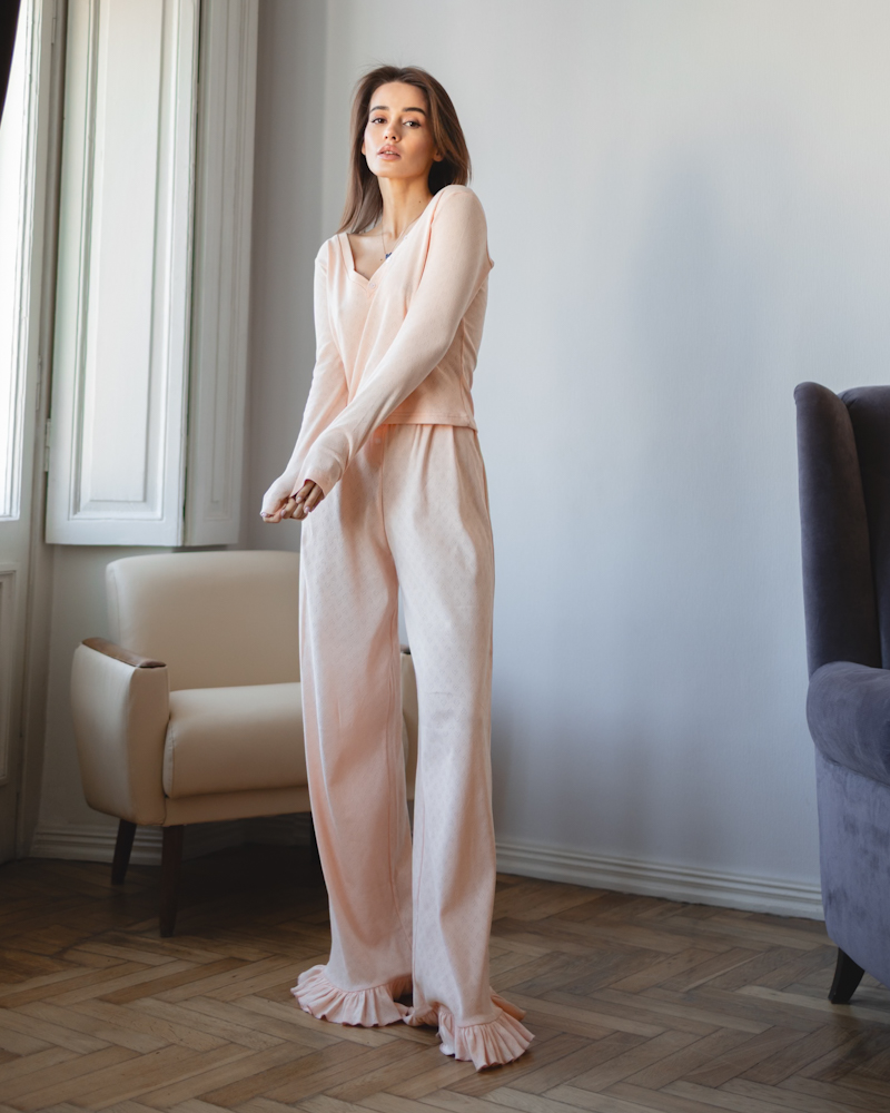 Комплект: лонгслів приталеного крою з V-подібним вирізом, штани вільного крою з рюшами знизу та шорти з розкльошеним силуетом, що красиво підкреслює лінію ніг та додає образу легкості.