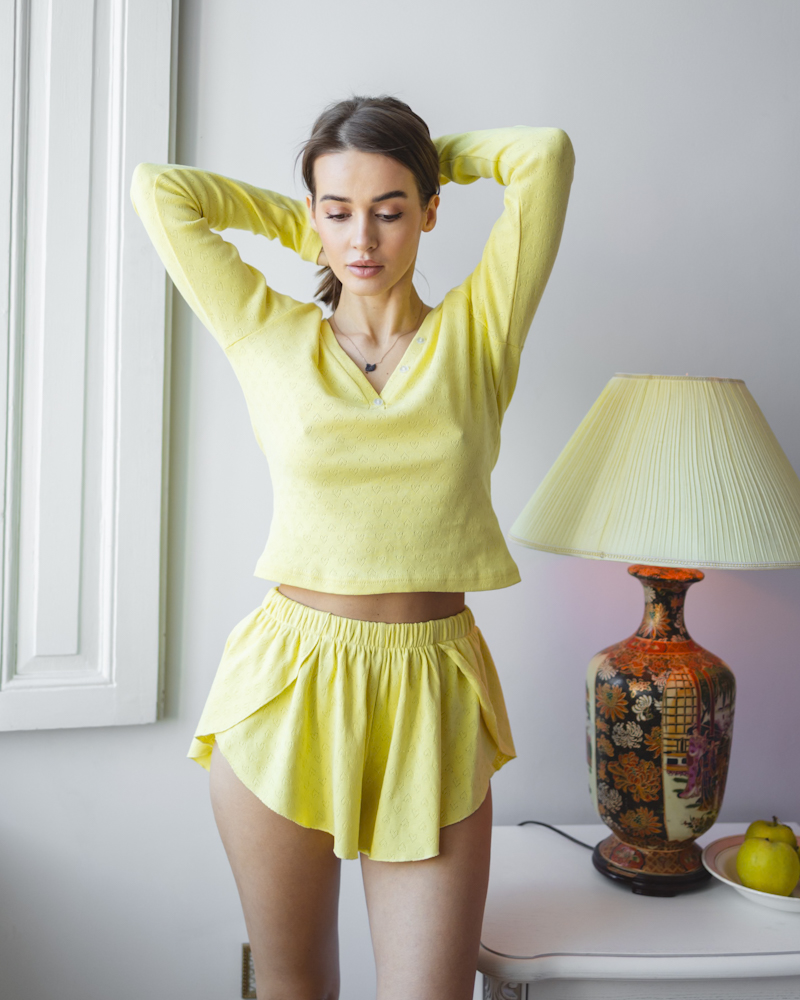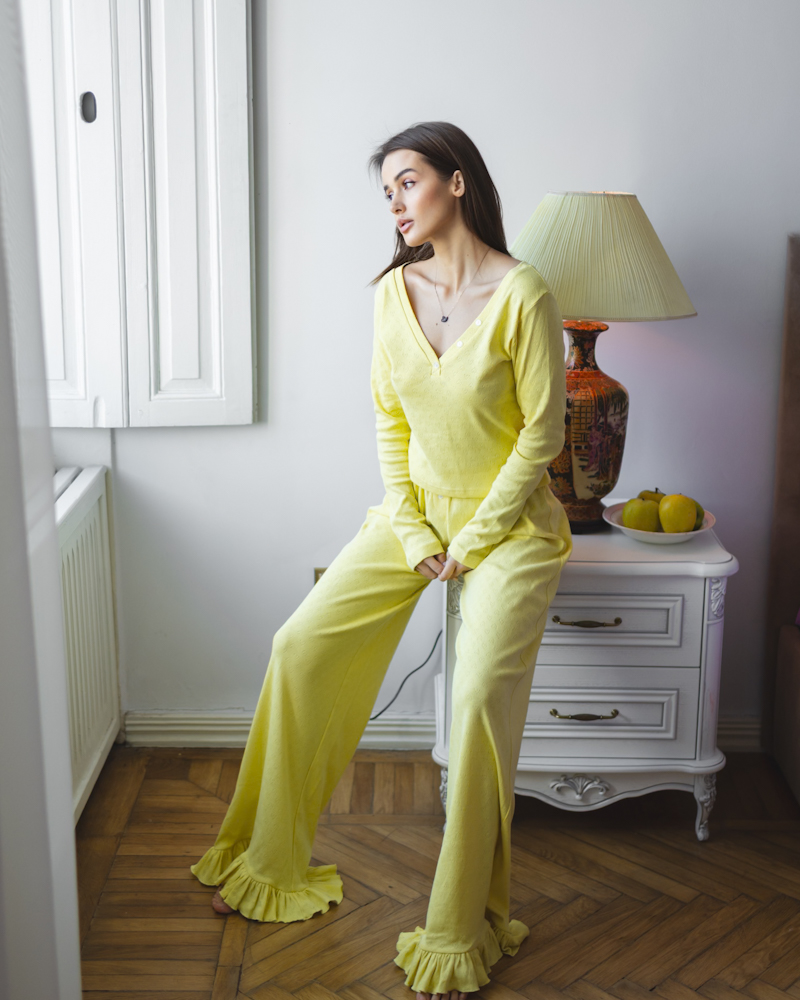 Комплект: лонгслів приталеного крою з V-подібним вирізом, штани вільного крою з рюшами знизу та шорти з розкльошеним силуетом, що красиво підкреслює лінію ніг та додає образу легкості.