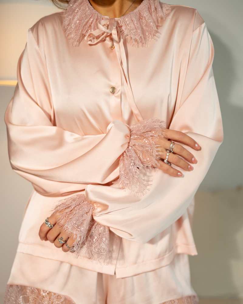 Сорочка вільного крою доповнена мереживним коміром і манжетами, що додають образу ніжності та романтичності. Шорти з еластичним поясом і мереживною обробкою забезпечують комфортну посадку.