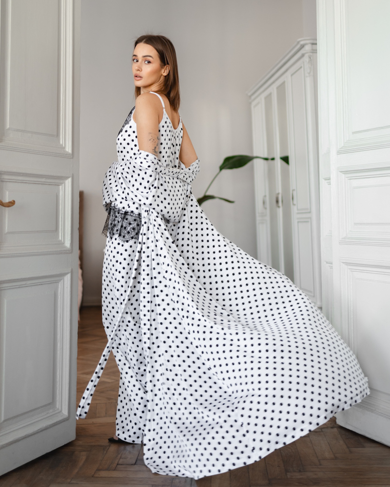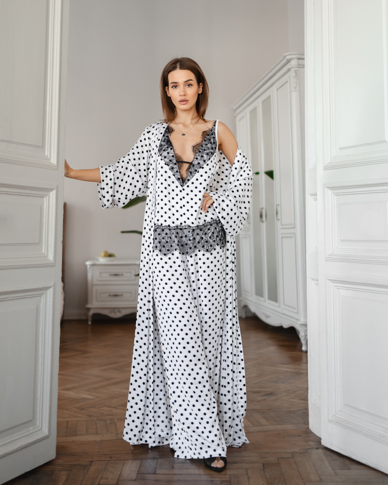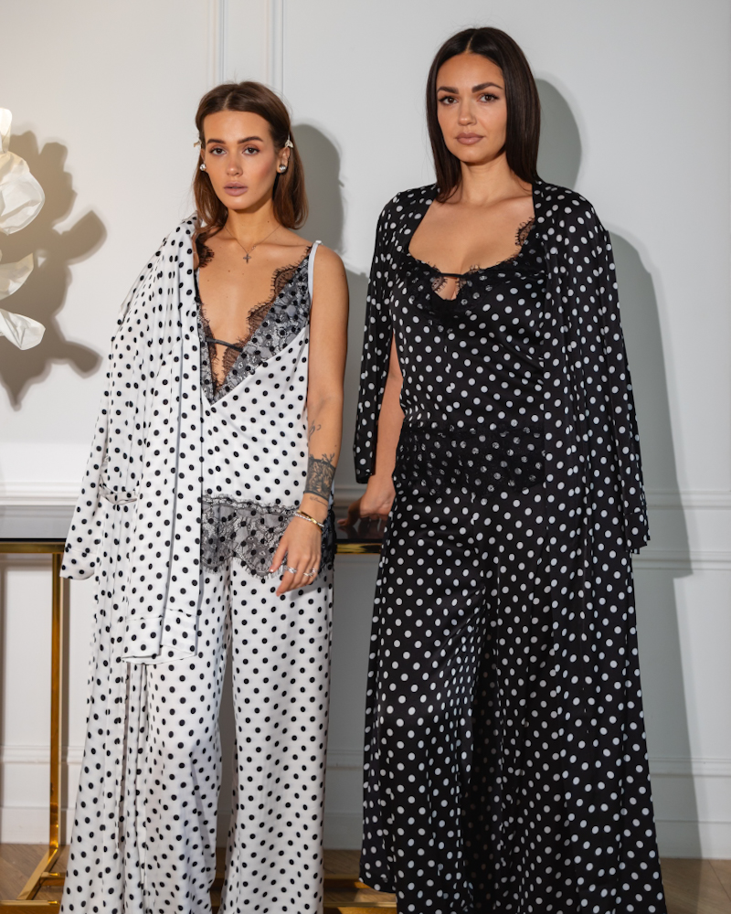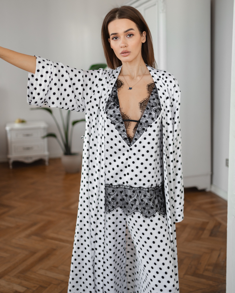 Сатиновий костюм-трійка з класичним принтом у горох, що додає образу шарму та легкої ретро-нотки.