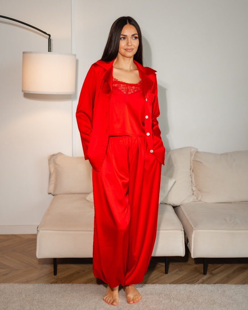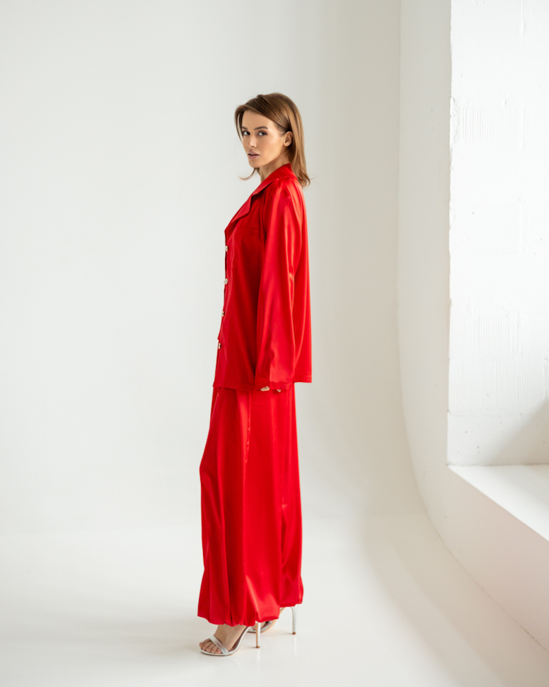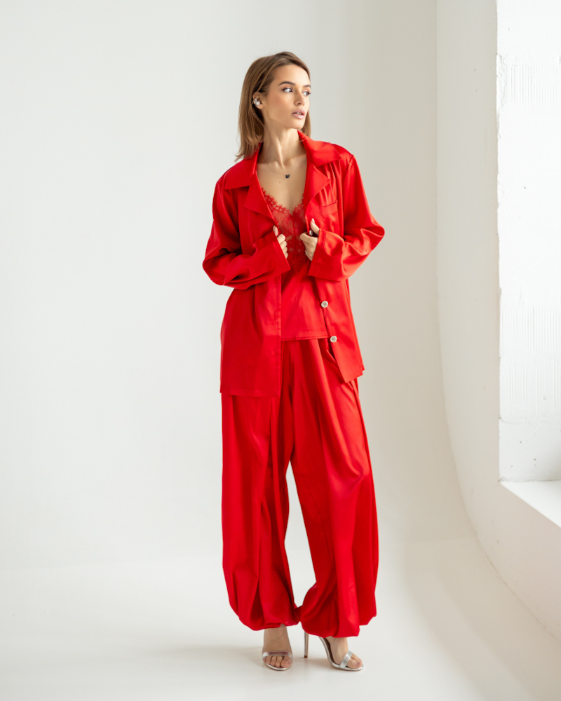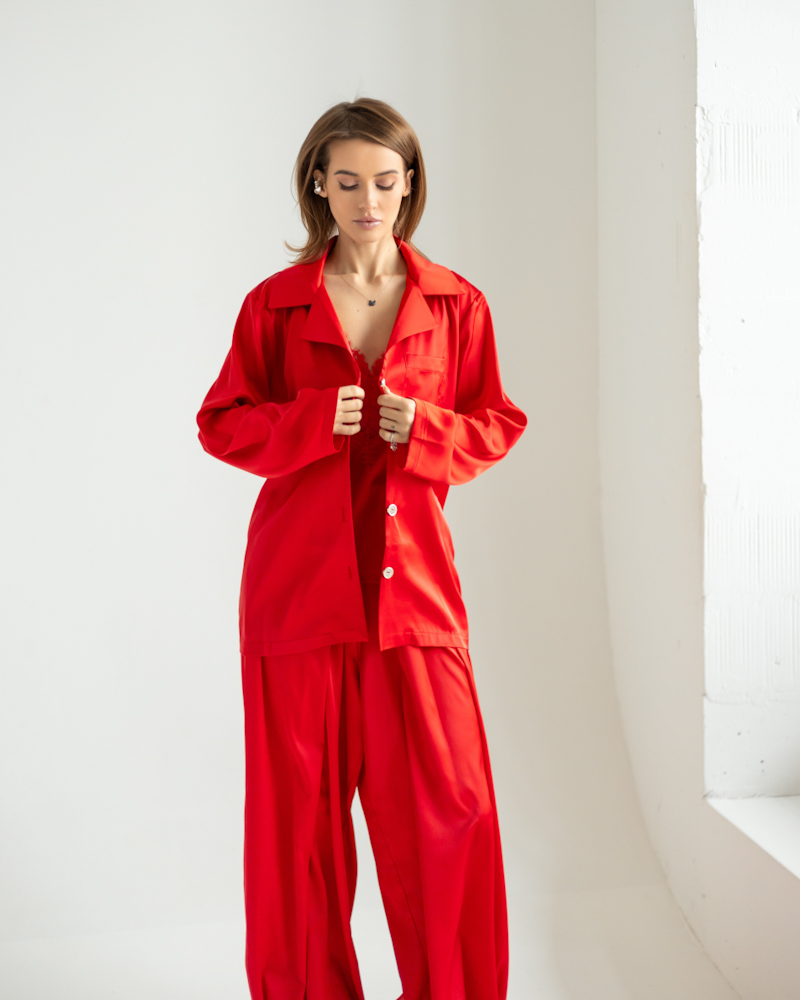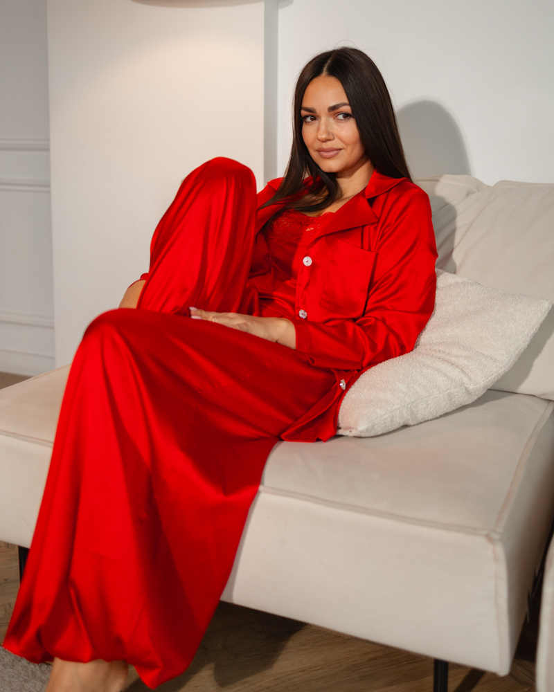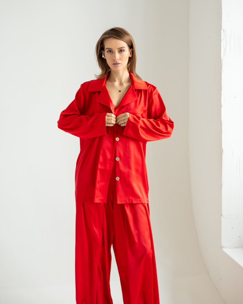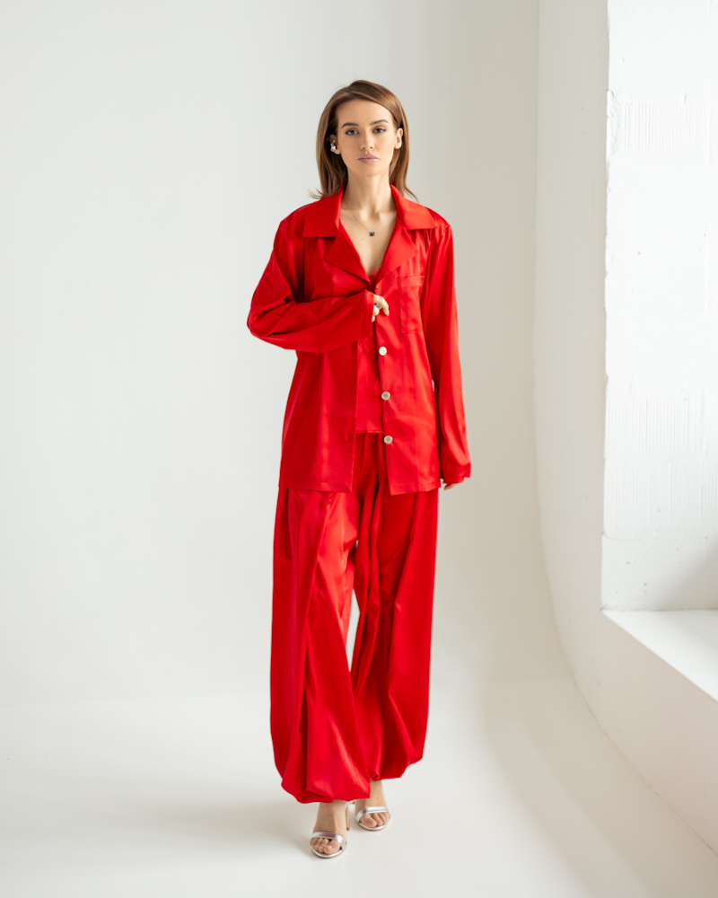Елегантний піжамний комплект із шовковистої тканини у насиченому червоному кольорі.