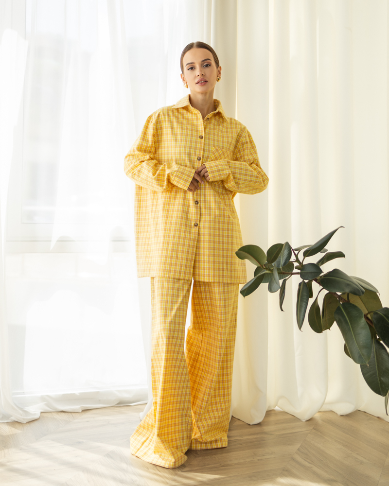 Комплект: довга сорочка на ґудзиках з кишенею, штани вільного крою з кишенями на резинці.