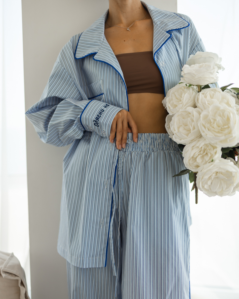 Комплект: довга сорочка із комірцем на гудзиках, рукава із манжетами, на грудях кишеня + вільного крою штани-палаццо з лампасами на резинці зі шнурком та кишенями.