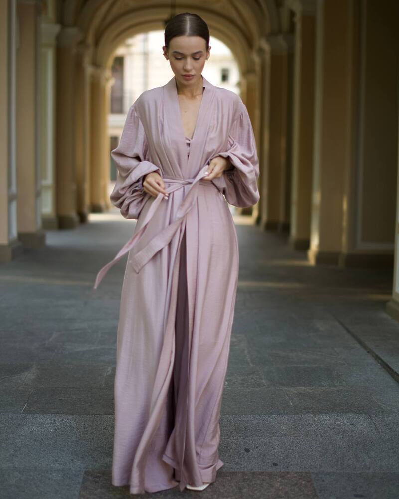 Комплект: довгий халат максі, ліф на застібці без чашечок, є регулятори на бретелях та довгі вільні штани кльош на резинці.