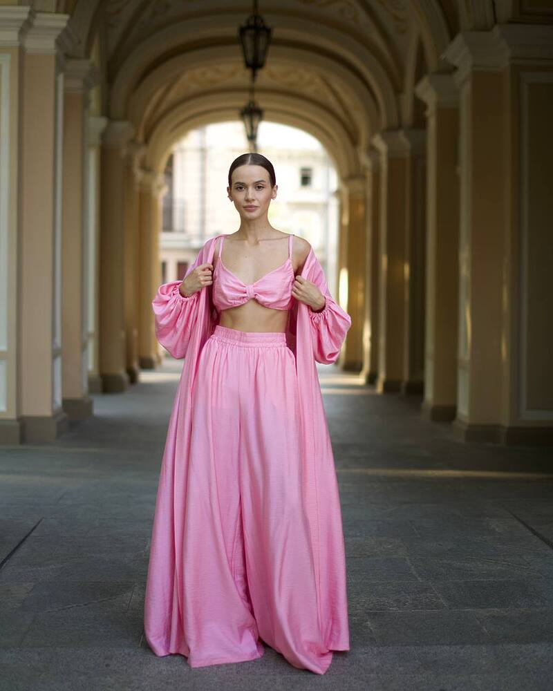 Комплект: довгий халат максі, ліф на застібці без чашечок, є регулятори на бретелях та довгі вільні штани кльош на резинці.