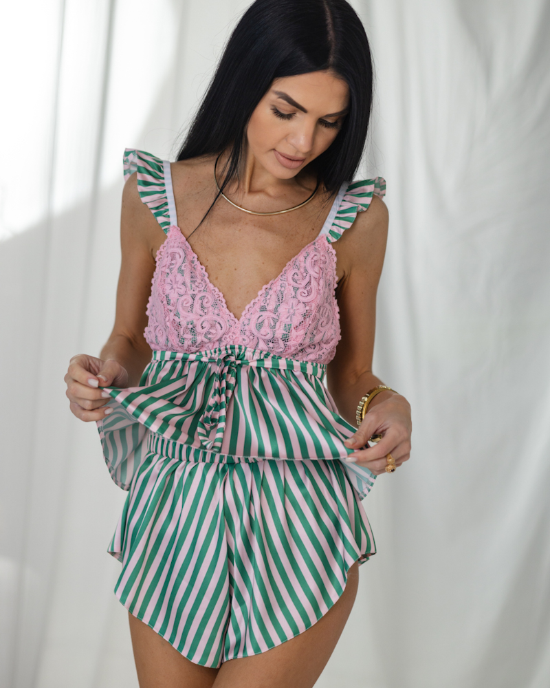 Піжама прикрашена мереживом на грудях, що додає ніжності та легкості образу. Фасон моделі сприяє комфортному сну та не сковує рухів.