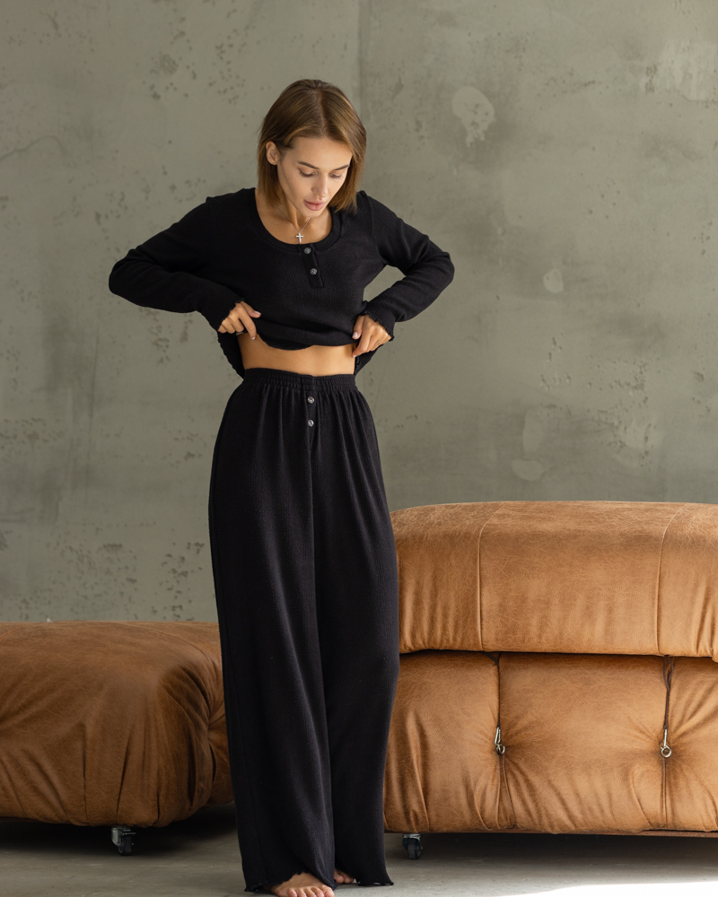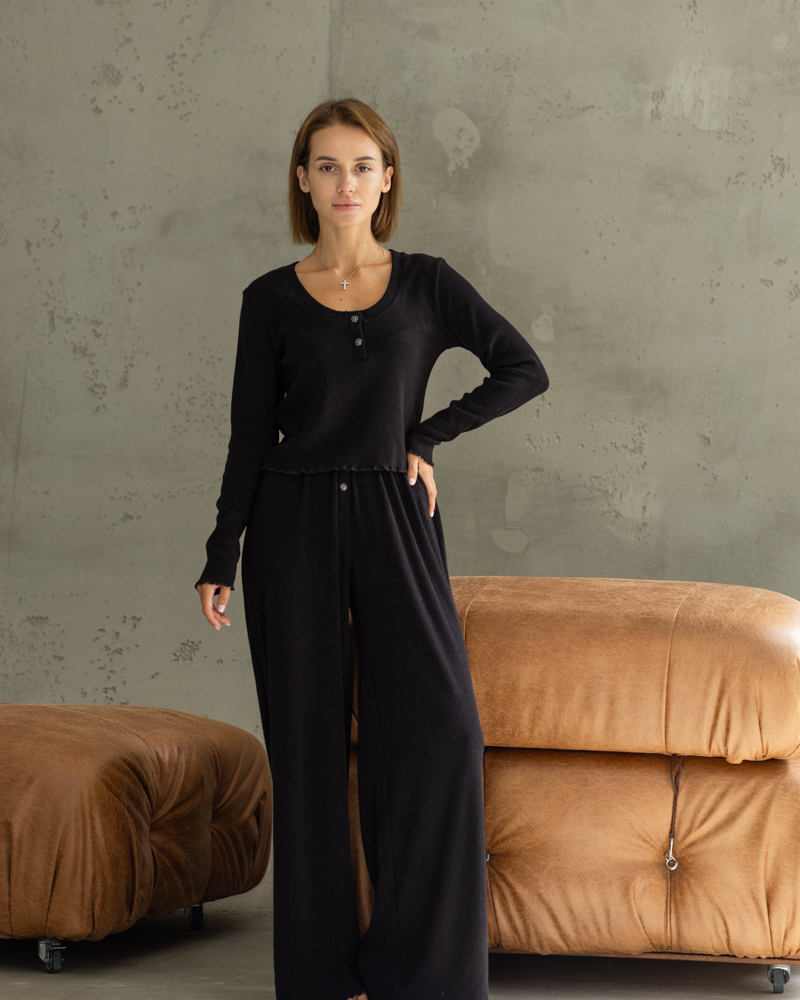 Комплект: кофта з ґудзиками та вільного крою штани на резинці.