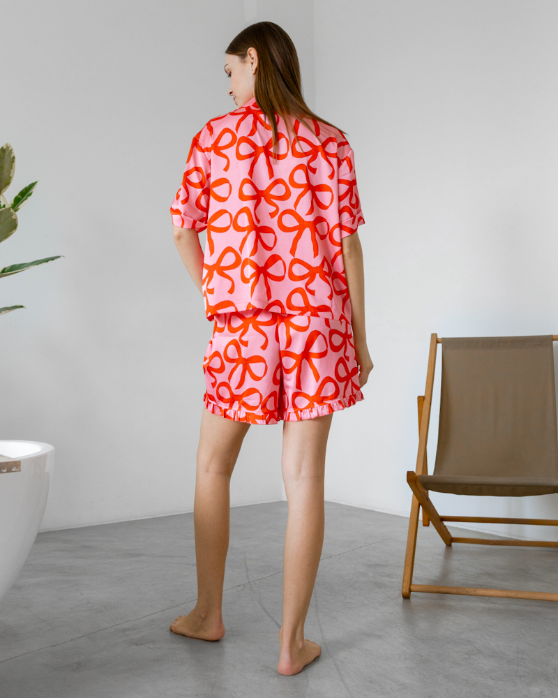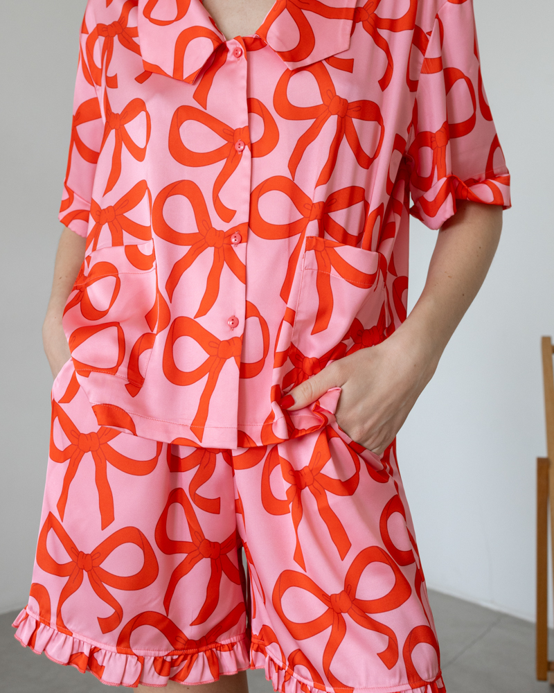 Жіноча піжама виконана із якісного шовку Армані із принтом бантики.