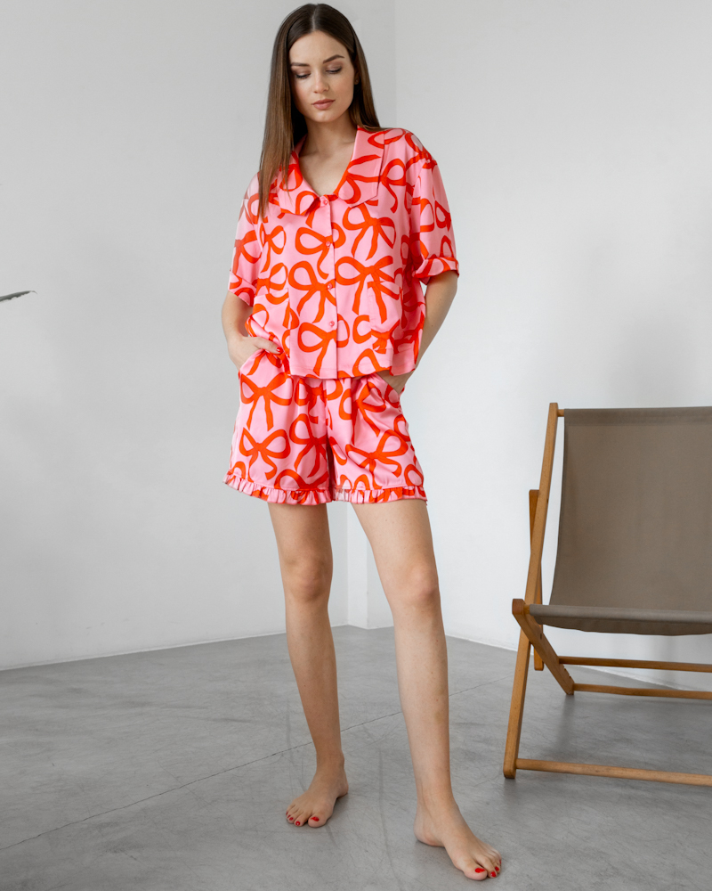 Комплект: сорочка на ґудзиках з коротким рукавом і кишенями та вільні шорти з воланами на резинці.