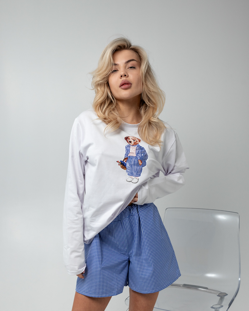 Комплект: тоненький лонгслів вільного крою та короткі шорти на резинці з кишенями.