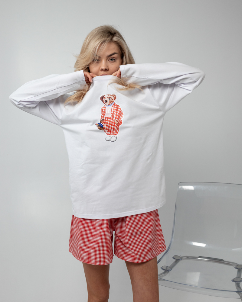 Комплект: тоненький лонгслів вільного крою та короткі шорти на резинці з кишенями.