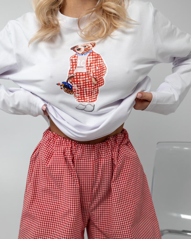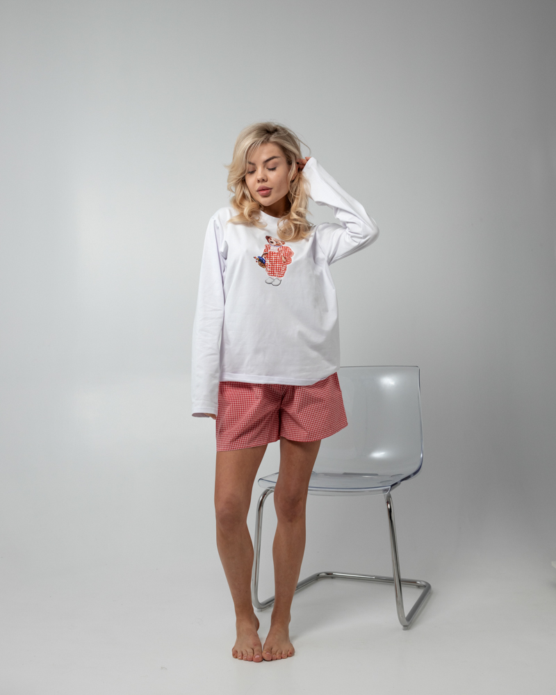 Комплект: тоненький лонгслів вільного крою та короткі шорти на резинці з кишенями.