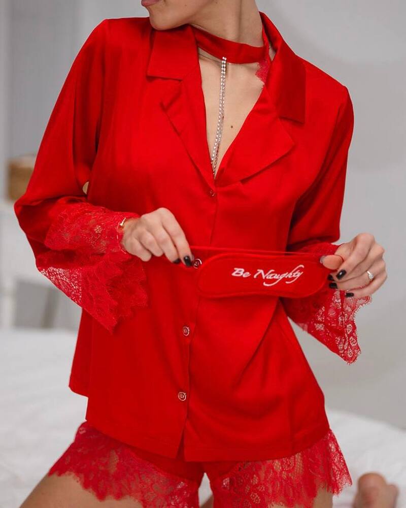 Комплект: сорочка на ґудзиках із глибоким розрізом на грудях, мереживний топ на застібці та короткі шорти на резинці.