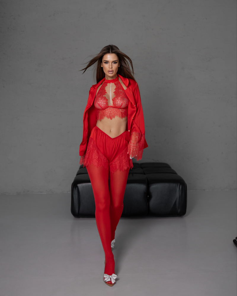 Піжамний костюм-трійка "Angelica" (сорочка+топ+шорти) шовк Армані та мереживо з ланцюжком Червоний