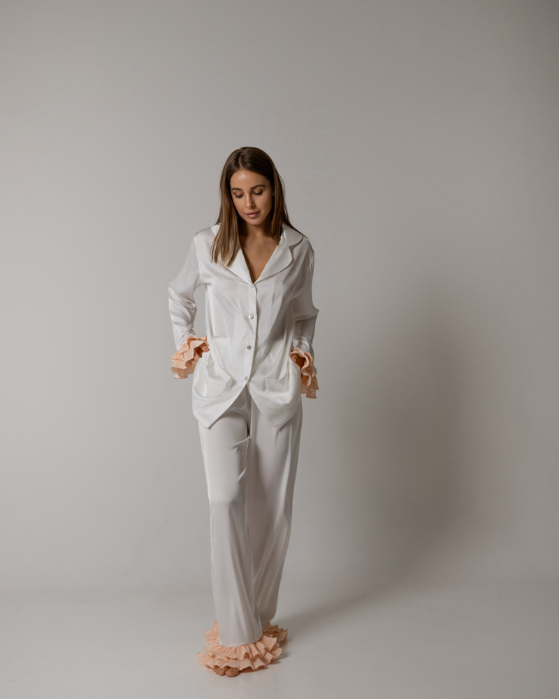 Низ рукавів та штанів оздоблено двоярусними рюшами, що додає образу неймовірної легкості та витонченості.