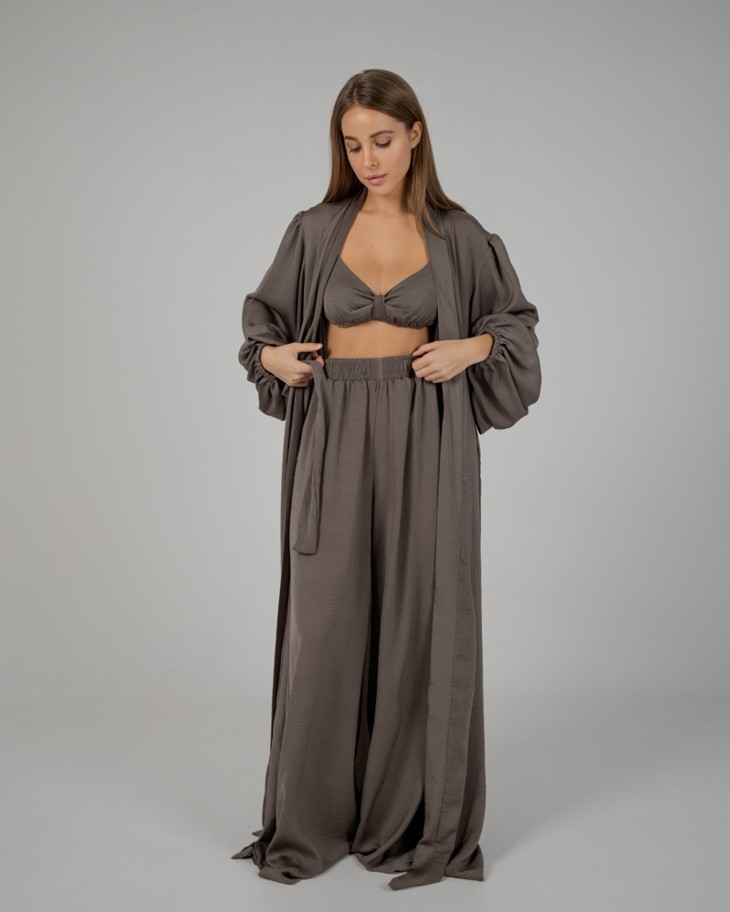 Комплект: довгий халат максі, ліф на застібці без чашечок, є регулятори на бретелях та довгі вільні штани кльош на резинці.